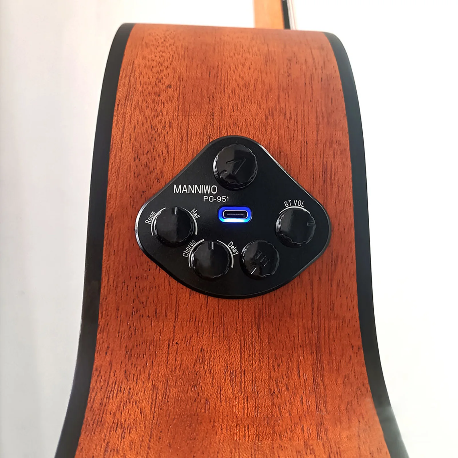 Función resonante: el altavoz plano conectado dentro de la guitarra hace que la caja de la guitarra vibre y suene para realizar efectos de sonido DSP, aumenta el volumen de resonancia de la caja del piano, y tocar la caja de guitarra se puede utilizar como un pequeño altavoz.