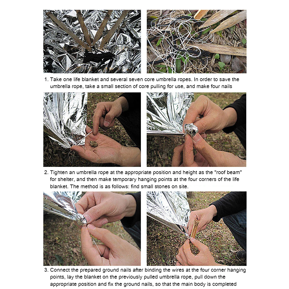 2.En días lluviosos, la manta de primeros auxilios se puede utilizar como poncho; se puede apuntalar como un dosel.
