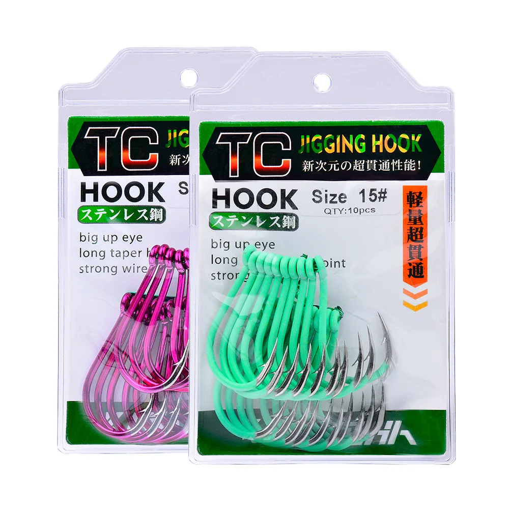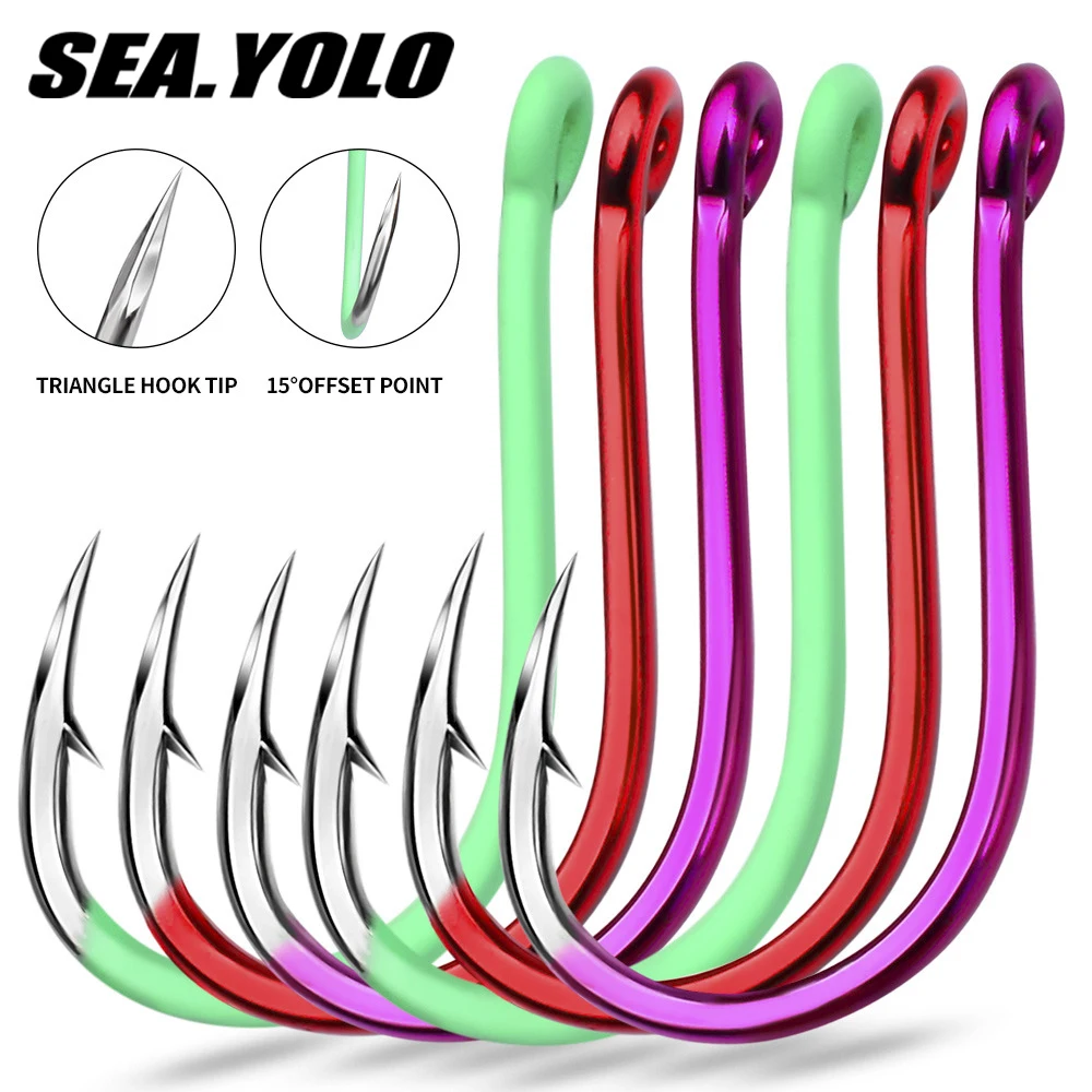 Mar Yolo-Anillo de agujero de señuelo, gancho de mango largo de boca torcida, gancho de púas de acero de alto carbono, luz nocturna, gancho de pesca en roca, 10 unids/lote por bolsa