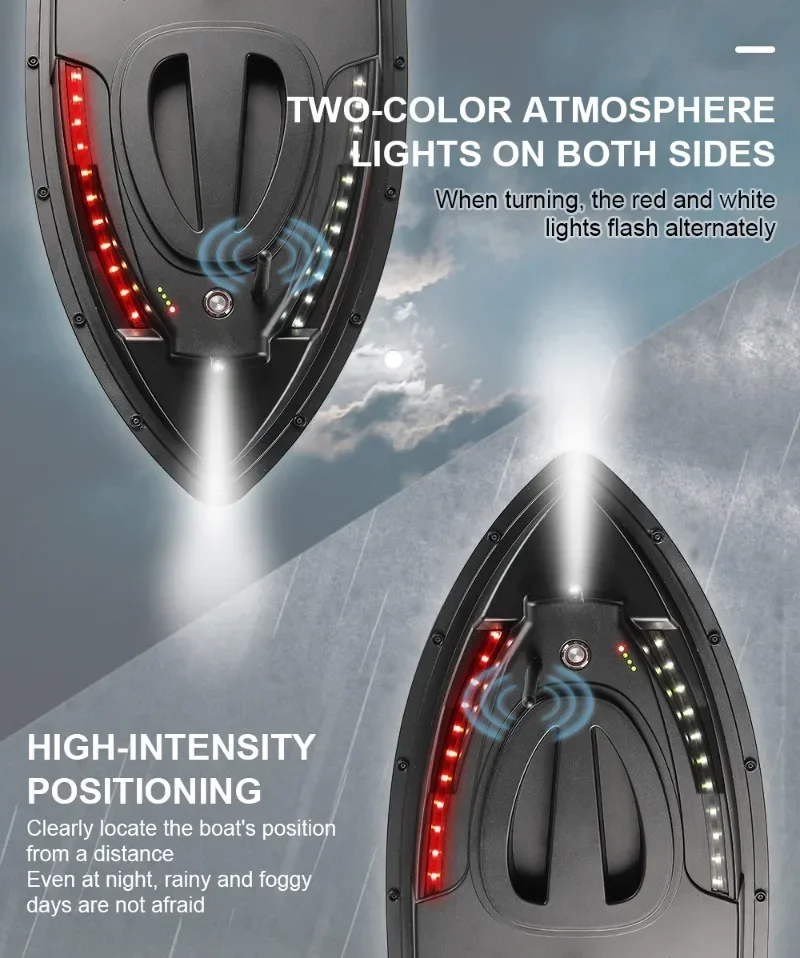 +High-brightness night navigation lights: The boat is equipped with high-brightness night navigation lights, and you can fish at night. There are two white turn signals and a navigation headlight on the bow. The direction of the ship's navigation can be easily identified by the color of the light.