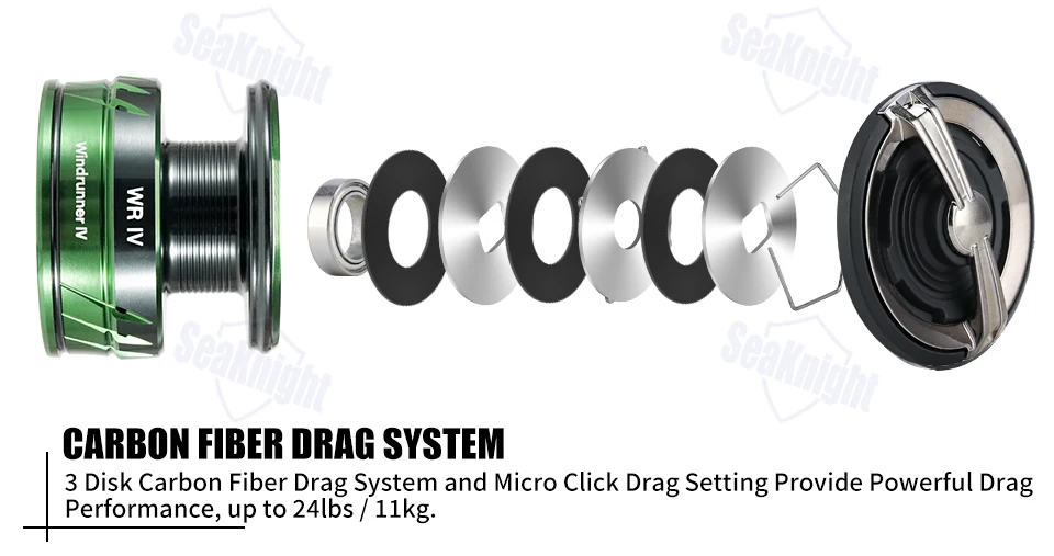 El sistema de arrastre de fibra de carbono de 3 discos y la configuración de arrastre de micro clic brindan un potente rendimiento de arrastre, hasta 24 lbs / 11 kg