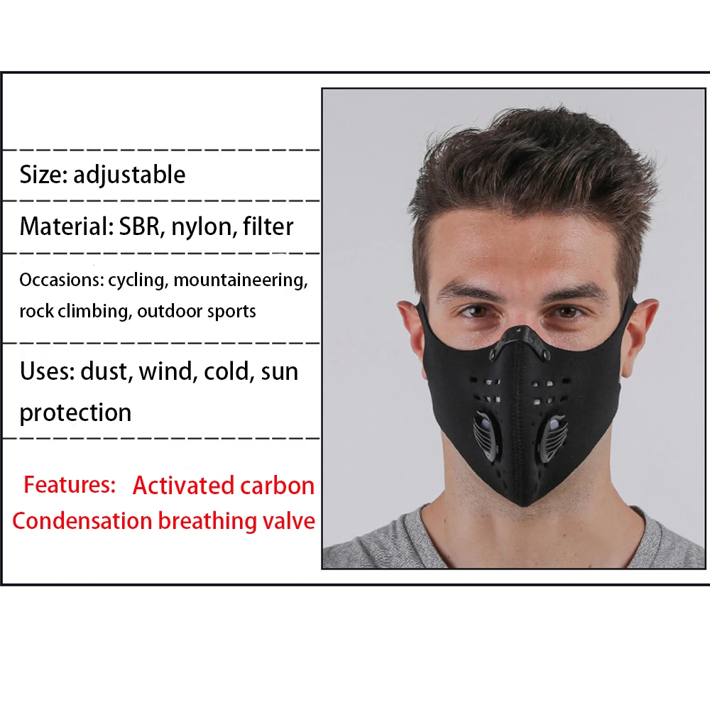 Función:1. Protección solar 2. Transpirable 3. A prueba de polvo 4. Protección contra el fríoFiltración de 5 capasVálvula respiratoria para reducir la acumulación de humedadMasajeador nasal ajustableChip reemplazable