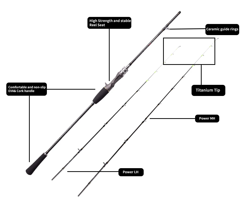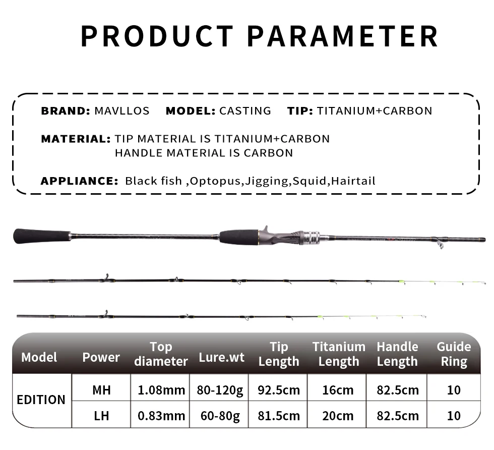 4. Esta caña es de acción rápida y puede soportar 12-25lb, y el peso del señuelo es 60-80g(LH). y 80-120g(MH)