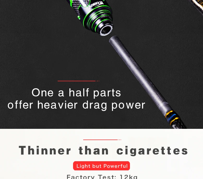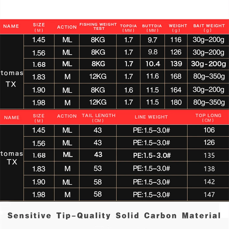 * Longitud: 1,56 M | Potencia: ML | Diámetro superior: 1,7mm | Diámetro inferior: mm | Peso 9,8: 126g | Peso del señuelo: 30-200g | PE: 1,5-3,0 # | Acción: Lento | Longitud del mango: 43cm | Longitud de la sección superior: 126cm