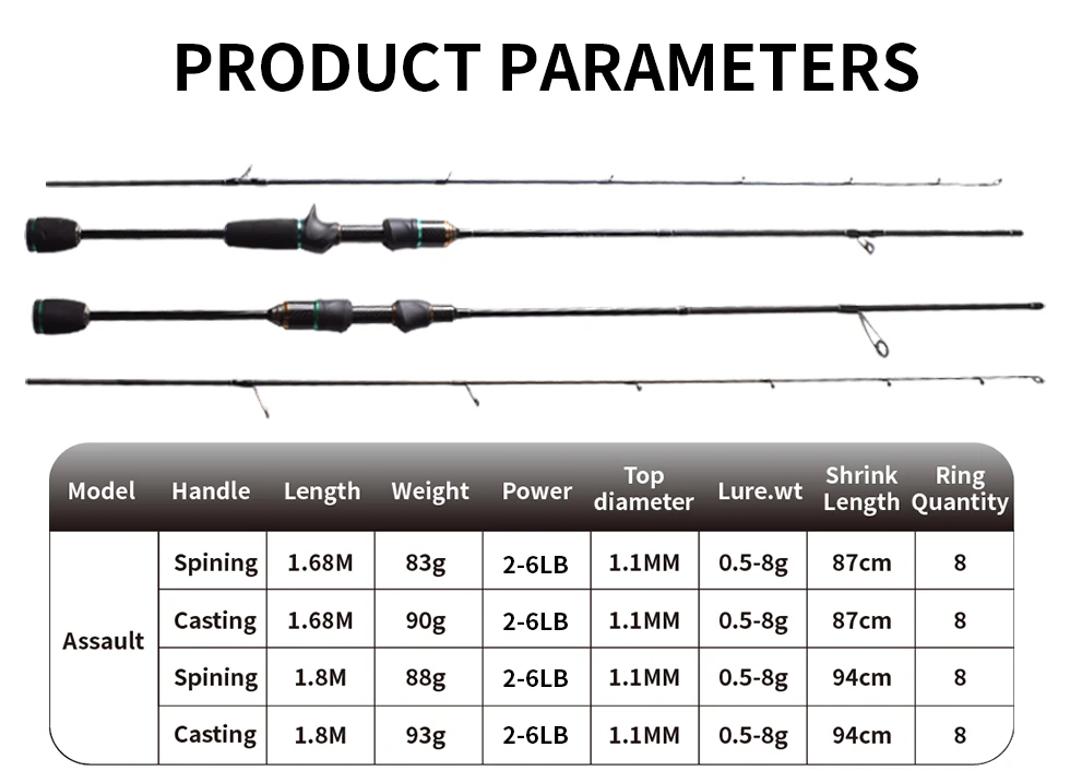 Longitud: 1,68 M|Longitud cerrada: 87cm|Peso: 90g|Peso del señuelo (sólido): 0,6-8g|Peso de la línea: 2-6lb|Acción (sólida): rápida|Potencia (sólida): UL|Punta: Punta sólida|Diámetro inferior: 7,05mm|Diámetro superior (sólido): 1,1mm|Sección: 2|