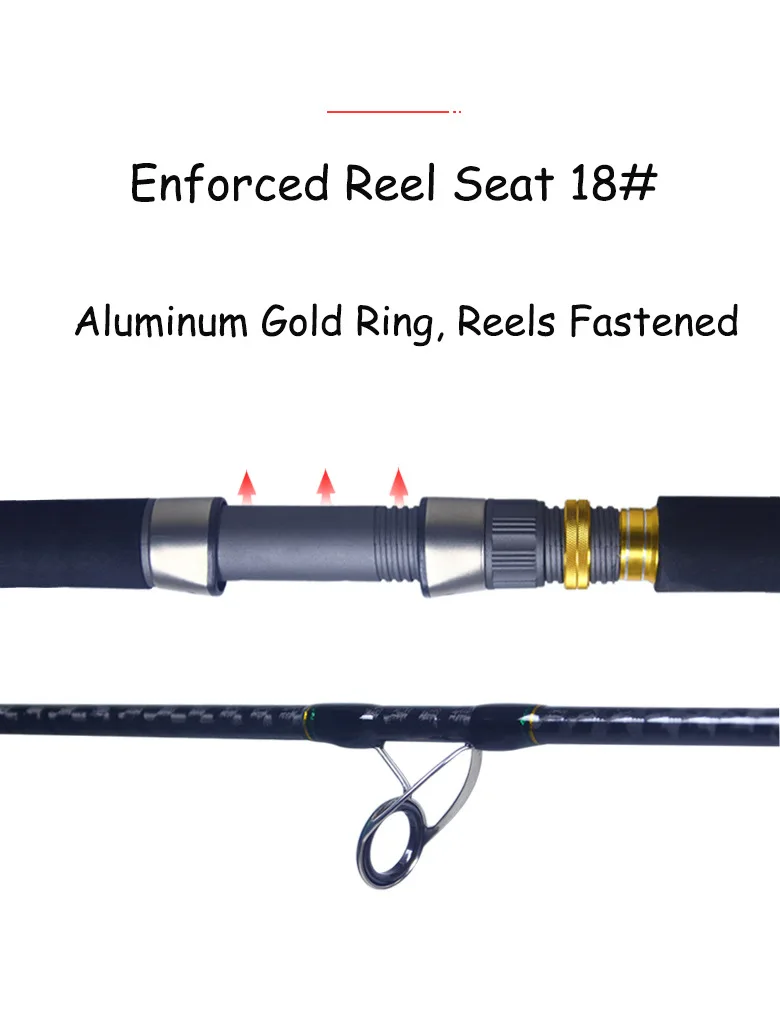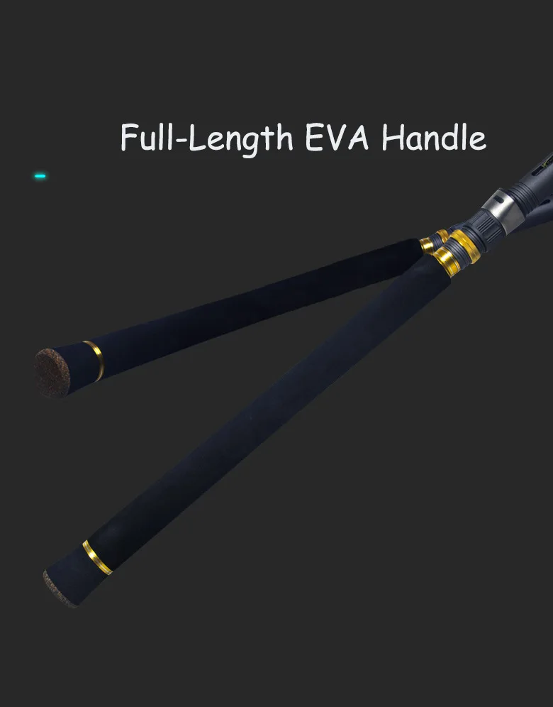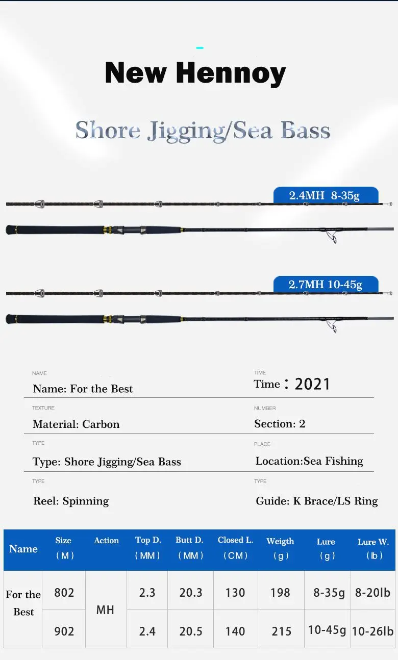 Parámetro:Longitud: 2,4 m 2,7 m | Longitud cerrada: 130cm 140cm | Caña giratoria | 2 secciones | Señuelo W : 8-35g/10-45g | Peso (aproximadamente): 198G 215g | Adecuado: Placa de hierro, lubina, jigging de goma | Dureza: MH