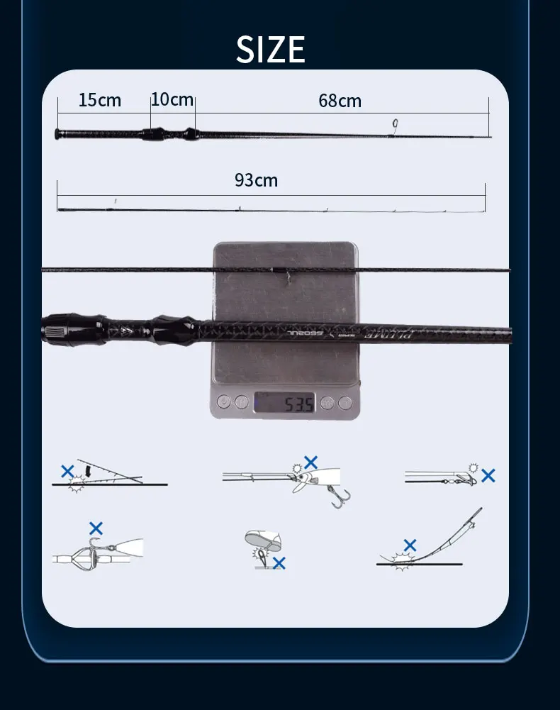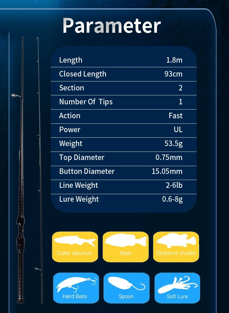 Length: 1.8m | Closed Length: 93cm | Section: 2 | Action: Fast | Power: UL | Weight:53.5g | Top Diameter: 0.75mm | Bottom Diameter: 15.05mm | Line Weight: 2-6lb