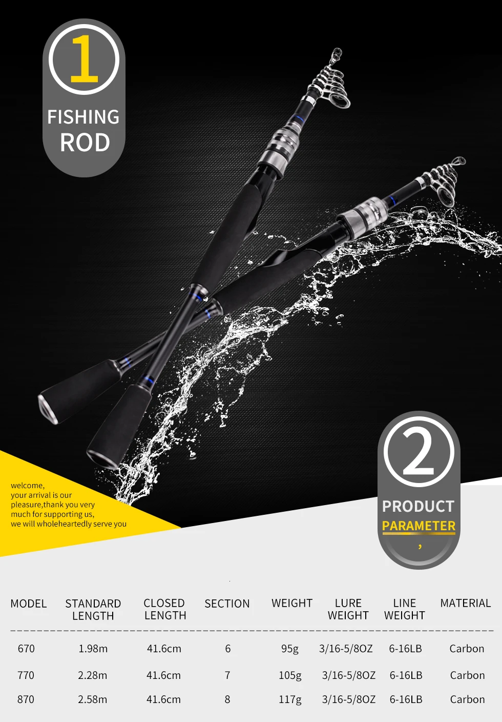 Modelo: 870|Longitud: 2,58 m| Longitud cerrada: 41,6 cm| Peso: 117 g| Potencia: ML| Acción: Acción rápida| Sección: 8| Material: fibra de carbono| Peso del señuelo: 3/16-5/8 oz 5-18 g| Peso de la línea: 6-16 libras
