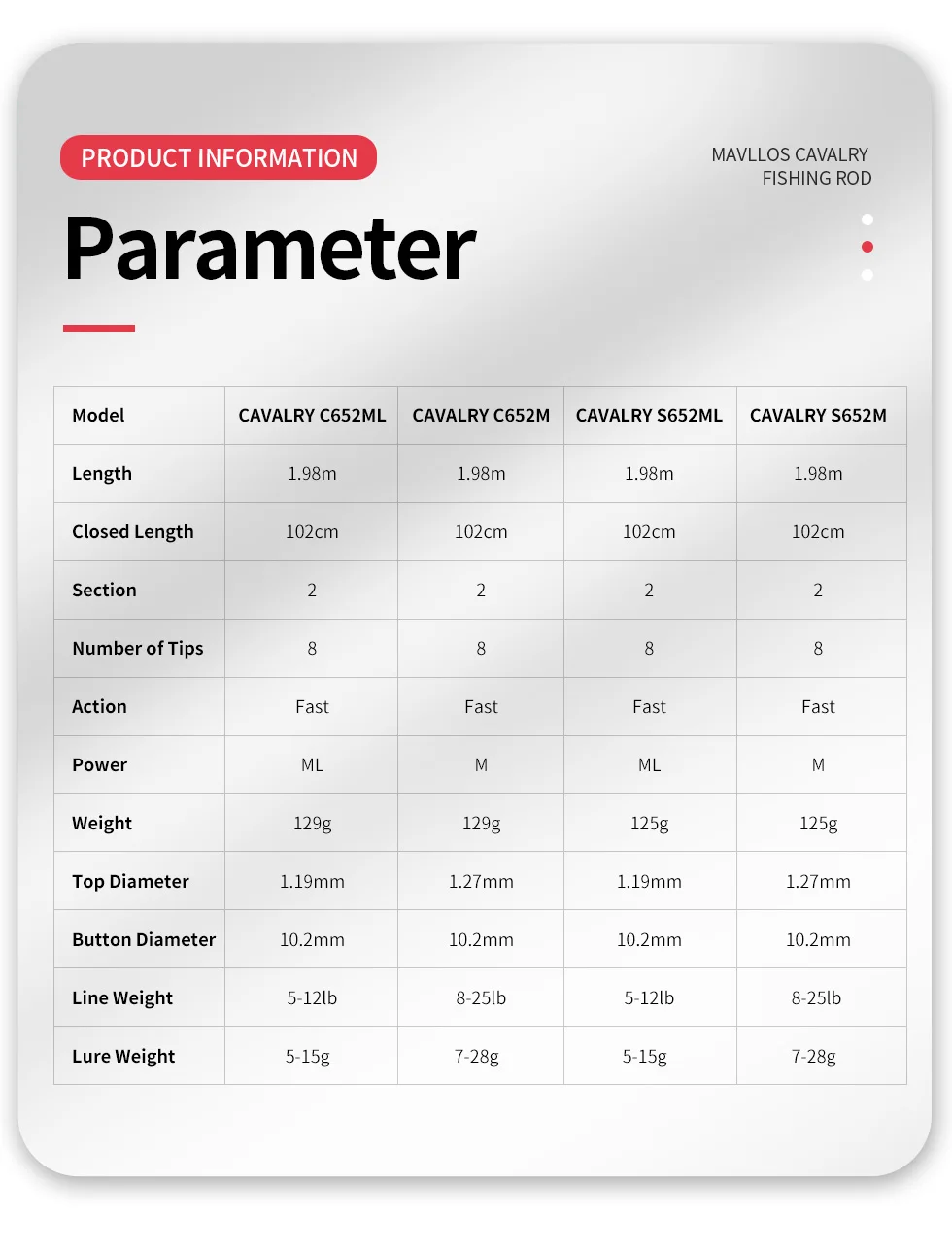La caña puede instalar la punta M o ML, que elige según diferentes peces, la punta ML es de 5-15g,5-12lb, las puntas M es de 7-28G, 8-25lb