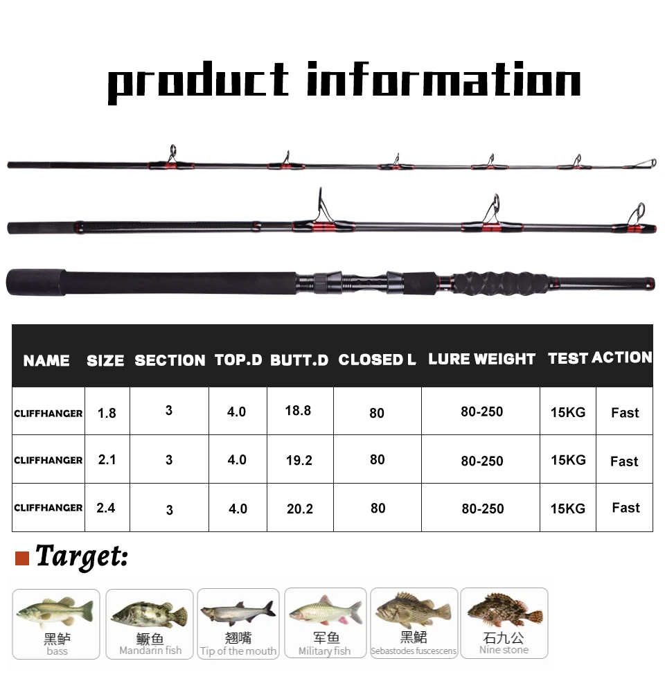 TAMAÑO: 1,8 | DIÁMETRO SUPERIOR: 4,0 | Peso: 358g | MODELO: Spinning | DIÁMETRO CULATA: 18,8mm | CERRADO L : 65cm | PESO DEL SEÑUELO: 80-250 | PRUEBA: 15KG | SECCIÓN: 3 |