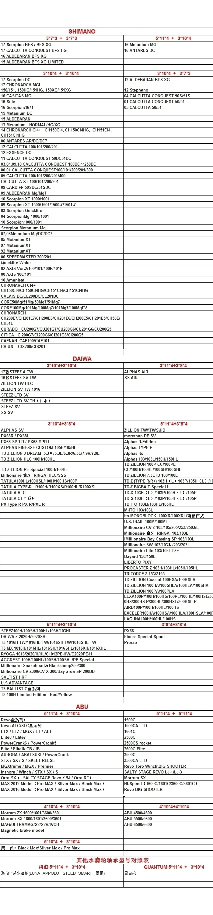 1)DAIWA spider TATULA:3*10*4 + 3*8*4 (Ambos rodamientos están en la cubierta lateral, es necesario abrir la caja de cambios para reemplazar)