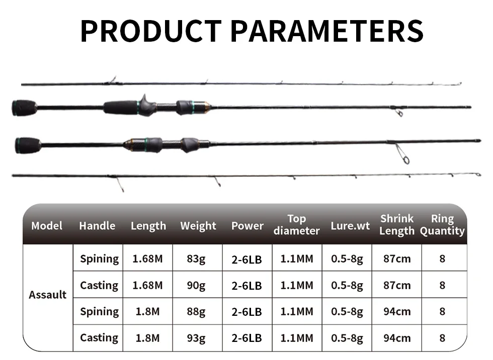 Tipo: fundición | Longitud: 1,8 m | Longitud cerrada: 0,88 M | Peso: 89g | Sección: 2 | Diámetro superior: 1,0mm | Diámetro inferior: 7,25mm | Peso del señuelo: 0,5-8g