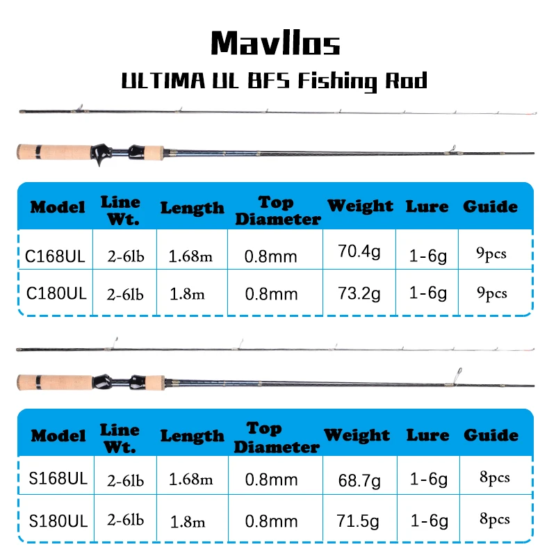 Varilla de fundición| Longitud: 1,68 m| Longitud cerrada: 88 cm| Sección: 2| Acción: Rápida| Potencia: UL| Peso: 70,4 g| Diámetro superior: 0,8 mm| Diámetro inferior: 13,8 mm| Peso de la línea: 2-6 libras|Anillo: Guía FUJI 9 piezas