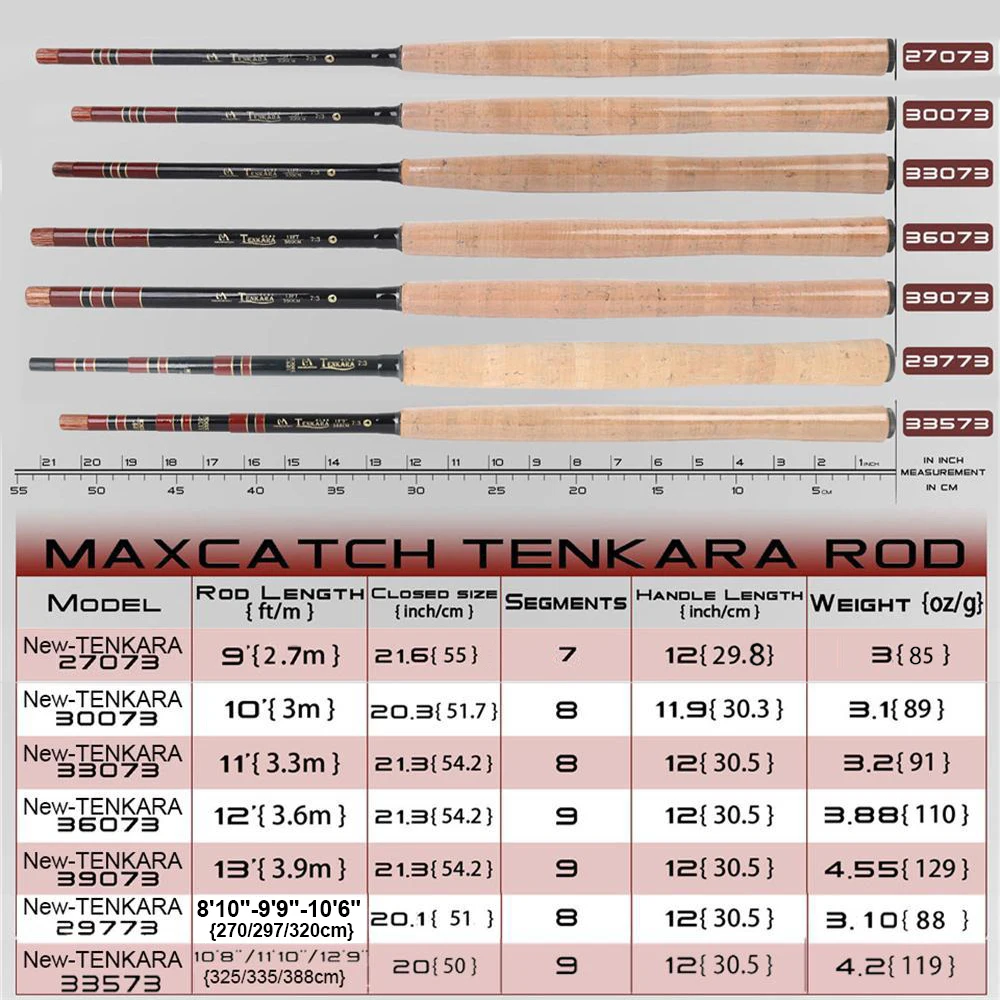 SEIS modelos Tenkara Rod: 5 varillas de longitud de 9 pies a 13 pies y 2 varillas de triple zoom para satisfacer las necesidades de todo tipo de entornos de pesca.