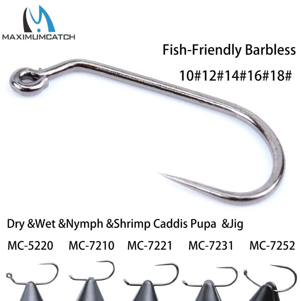 Captura máxima 100 piezas 10#-18# Anzuelos de pesca con mosca sin púas aptos para peces, secos, húmedos, ninfas y camarones, Caddis Pupa y plantilla