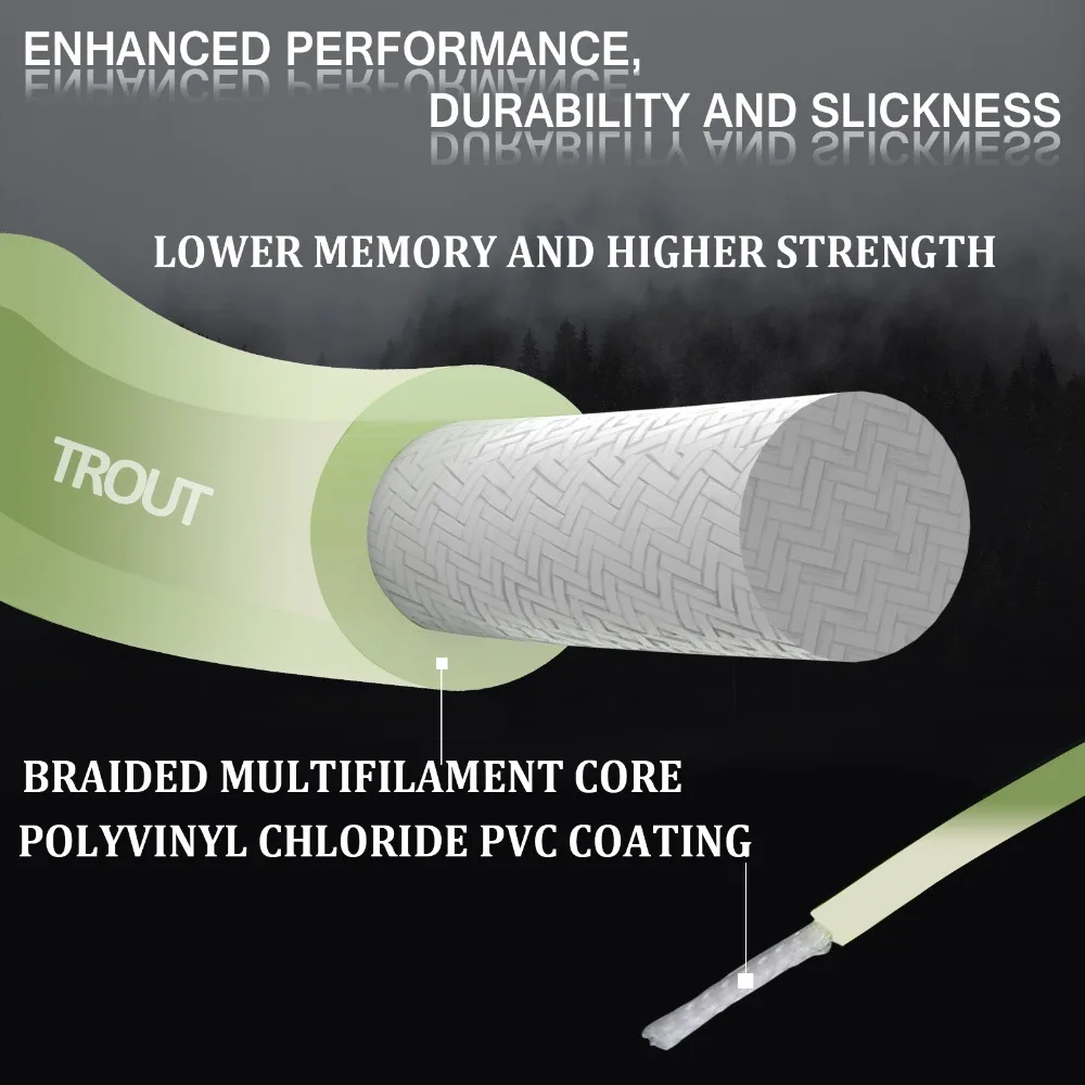 Recubrimiento de PVC con suavizante especial añadido para un rendimiento súper resbaladizo-La línea de vuelo se desliza fácilmente a través de las guías de varilla y flota bien en agua tibia e incluso fría. El revestimiento resbaladizo dispara la línea aún más lejos.