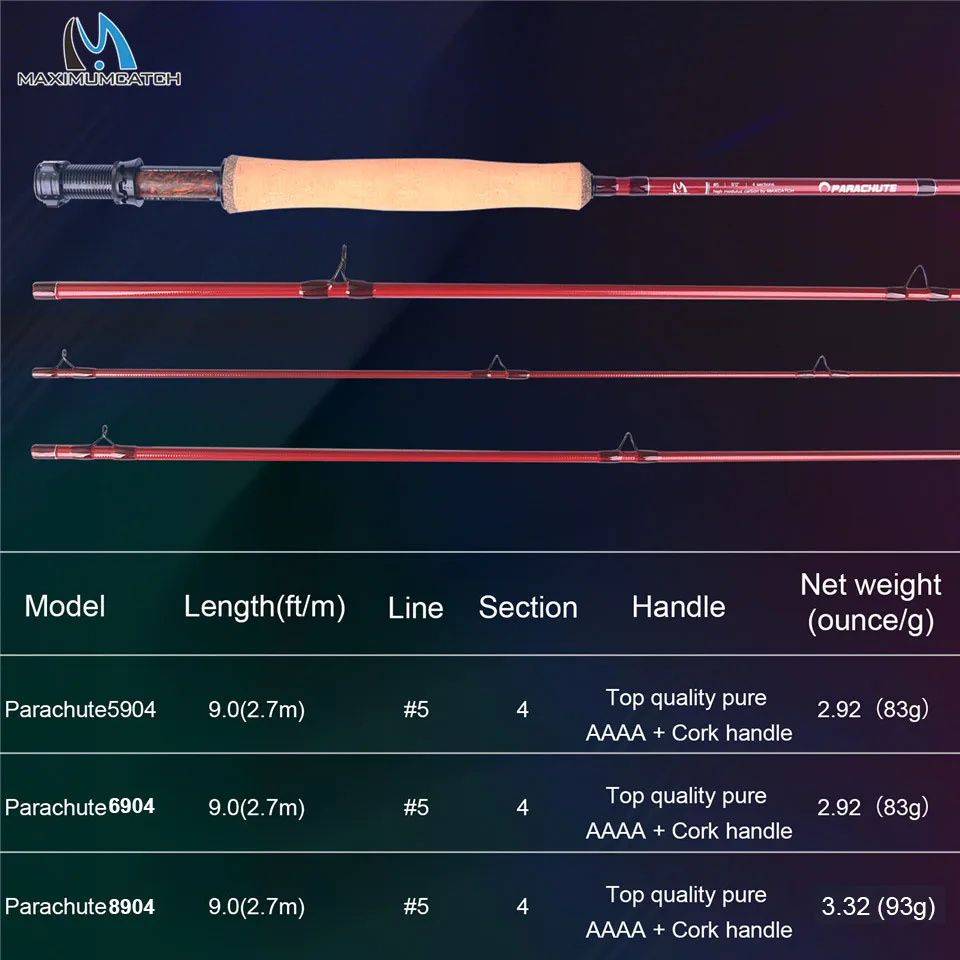 Maximumcatch paracaídas de alto grado 9 pies 5/6/8wt 4PC IM12/40T fibra de carbono súper ligera caña de pescar con mosca de acción rápida
