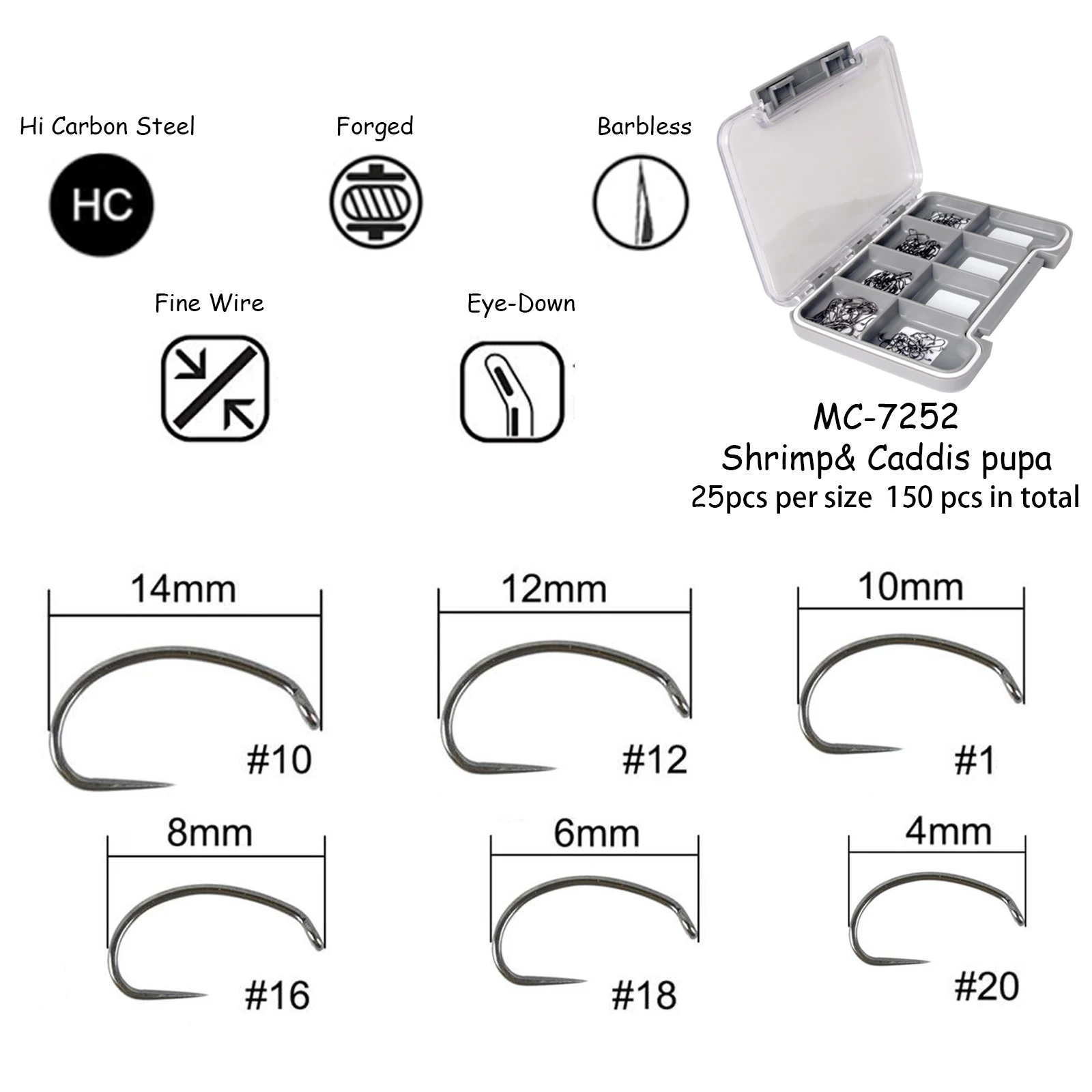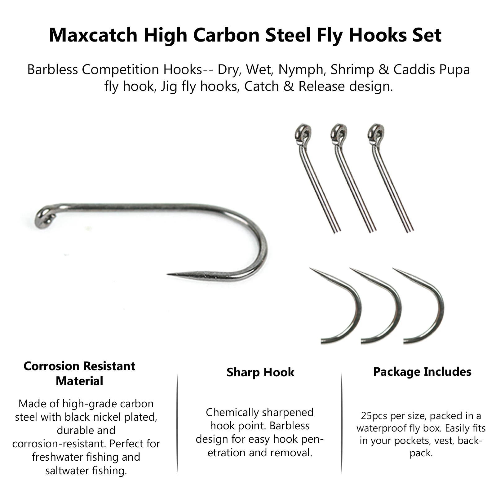 --Con ojo hacia abajo, curvatura especial, vástago medio, puntas químicamente afiladas y acero al carbono de alta calidad.