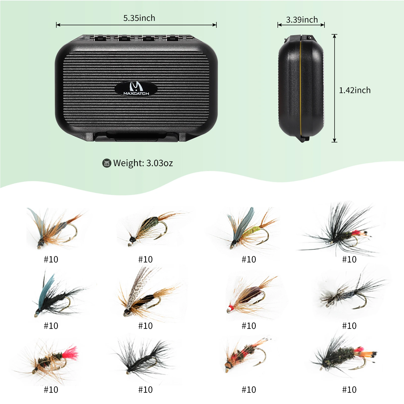 *****FALOS, CAJA Y BOLSA PARA CARRETAS: una bolsa para caña de viaje duradera pero también conveniente con bolsa para carretes para guardar todo junto. Caja para moscas flotante e impermeable: 5,24''X3.54''1,38'', con capacidad para 372 moscas. Incluye 12 moscas secas y húmedas atadas a mano, tamaño del gancho: # 10. Se incluye una bolsa de neopreno para carrete para una fácil protección del carrete.