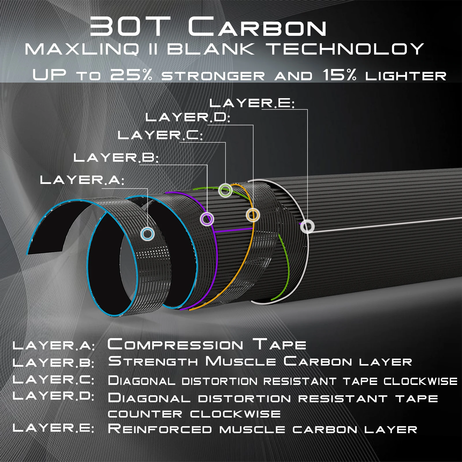 ***TECNOLOGÍA EXCLUSIVA DE BLANK MAXLINQ II: Fibra de carbono pura IM8 30T.Con 5 capas mixtas de carbono que incluyen una capa de carbono Músculo Reforzado para un aumento de al menos un 25 % de resistencia pero un 15 % más liviano.Sacudimos un poco de peso para hacer una caña mucho más fuerte.