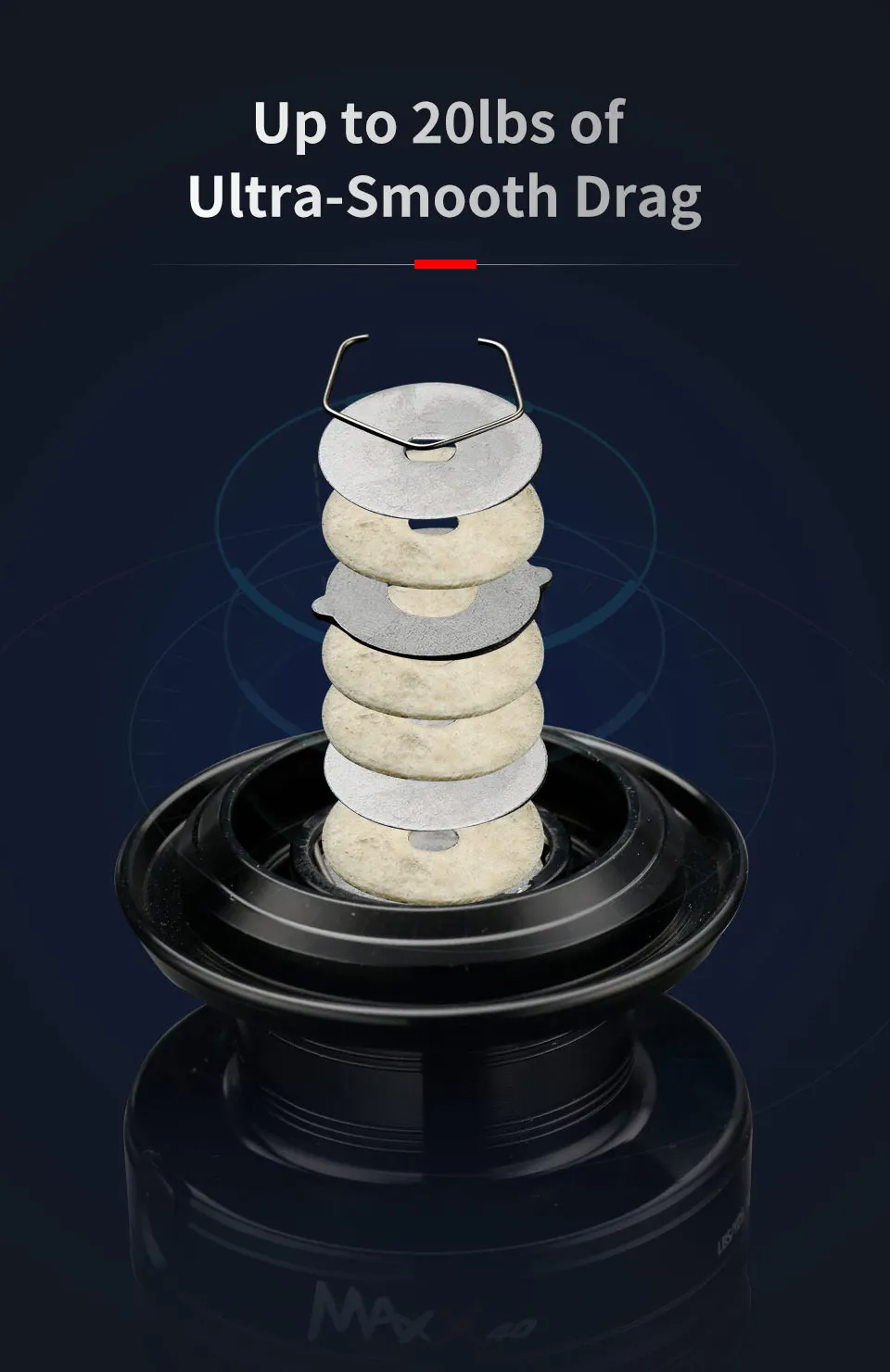 Max X 20 :-Capacidad de línea (YD/lb) - 130/8/Arrastre máximo-7lb/Relación de engranaje-5,2: 1/Peso del carrete-7,5 oz
