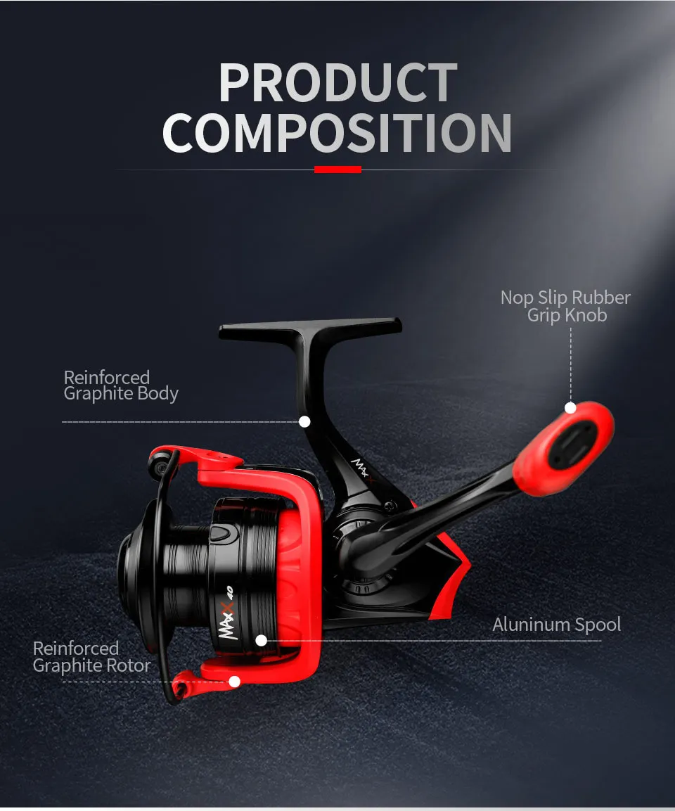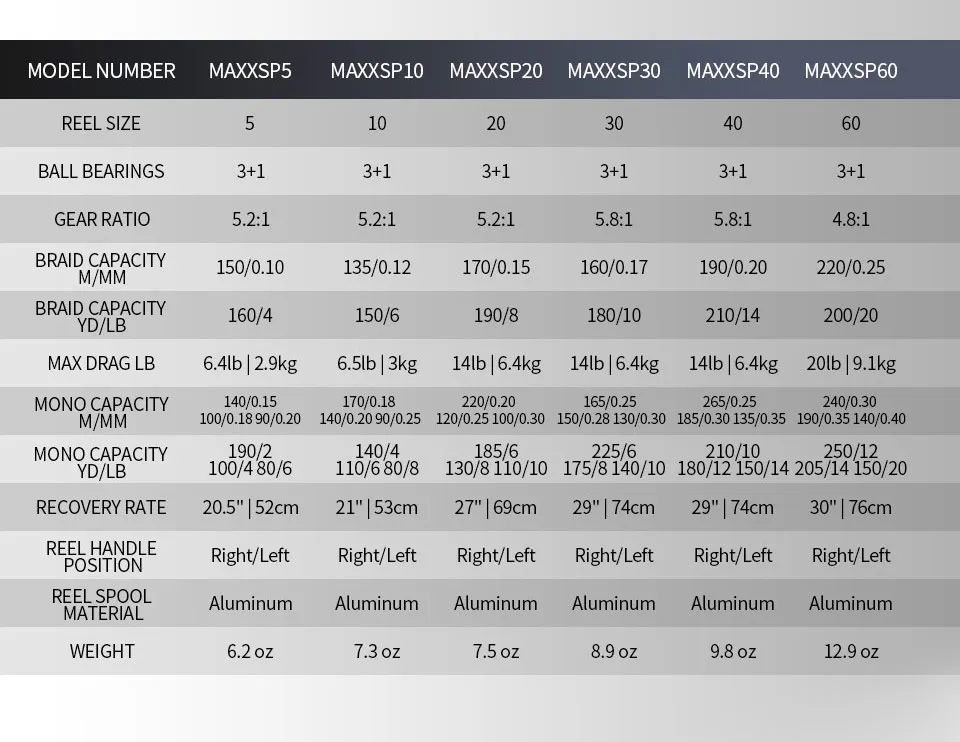 Max X 60 :-Capacidad de línea (YD/lb) - 205/14/Arrastre máximo-20lb/Relación de engranaje-4,8: 1/Peso del carrete-12,9 oz