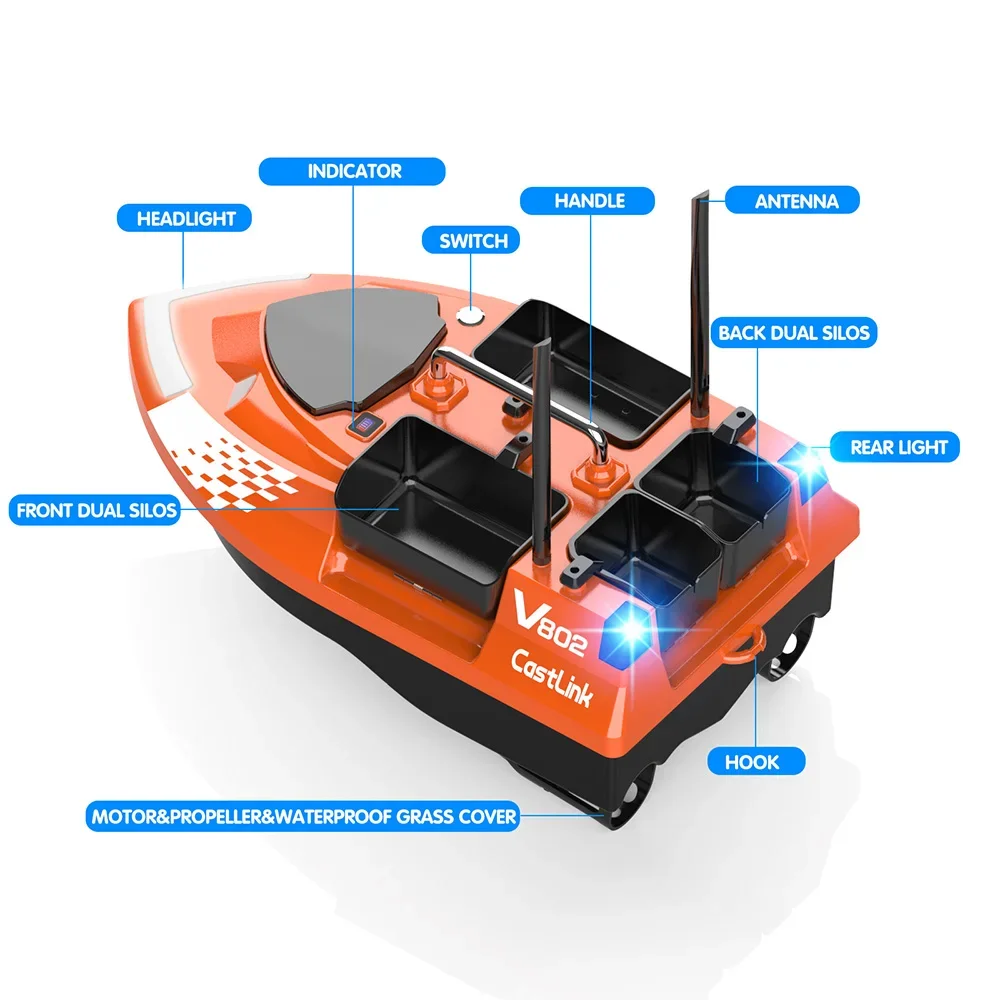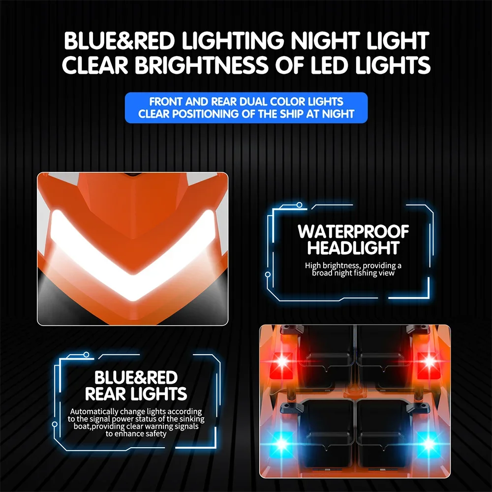 Diseñado para uso diurno y nocturno, el barco incluye una luz de navegación delantera de alto brillo y luces indicadoras de dirección traseras para mayor visibilidad y control. También admite funciones de liberación de gancho y entrega de línea, lo que le brinda total flexibilidad en su estrategia de cebo.