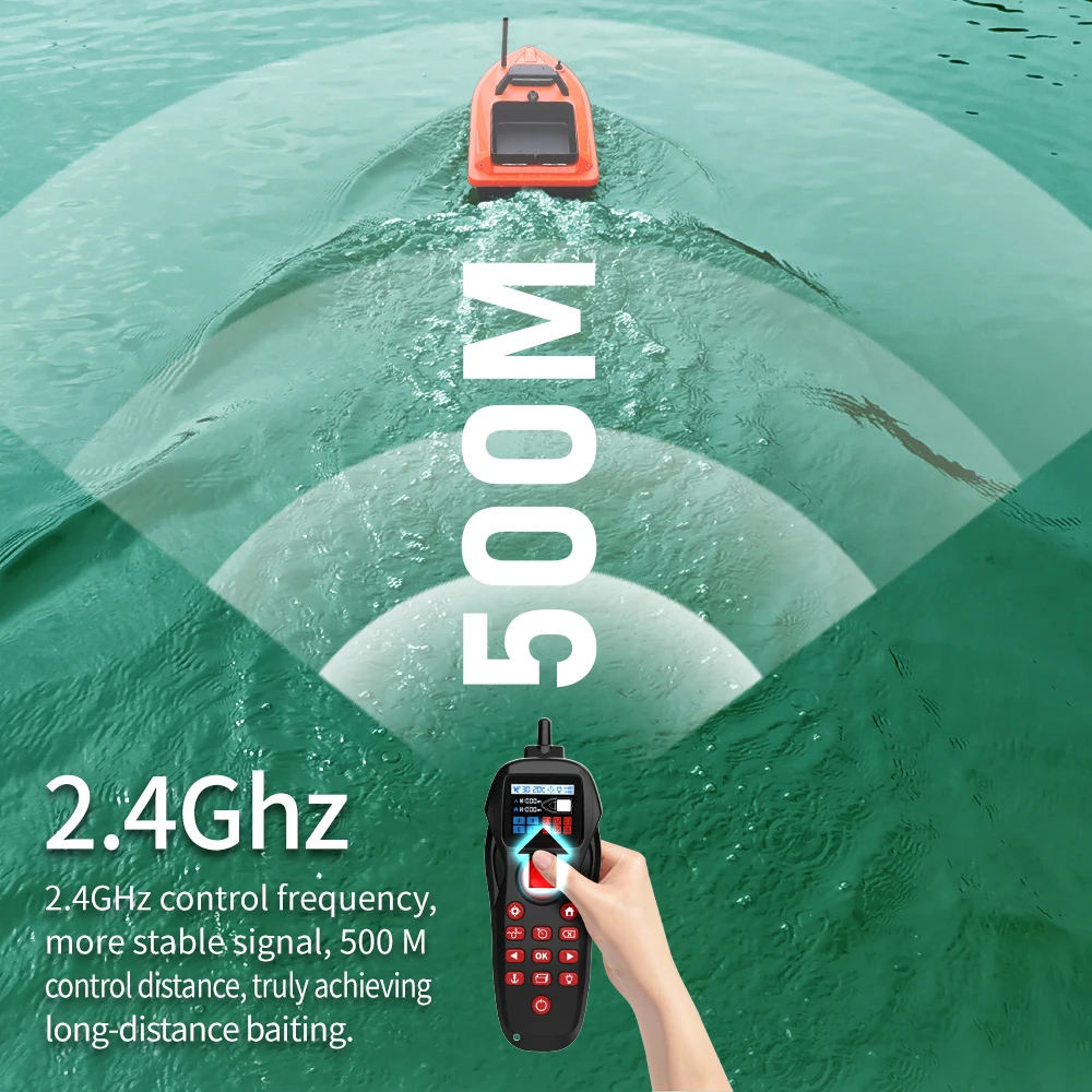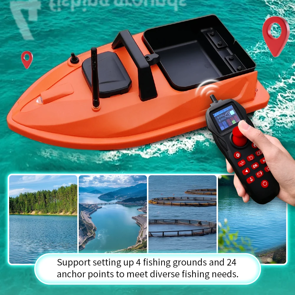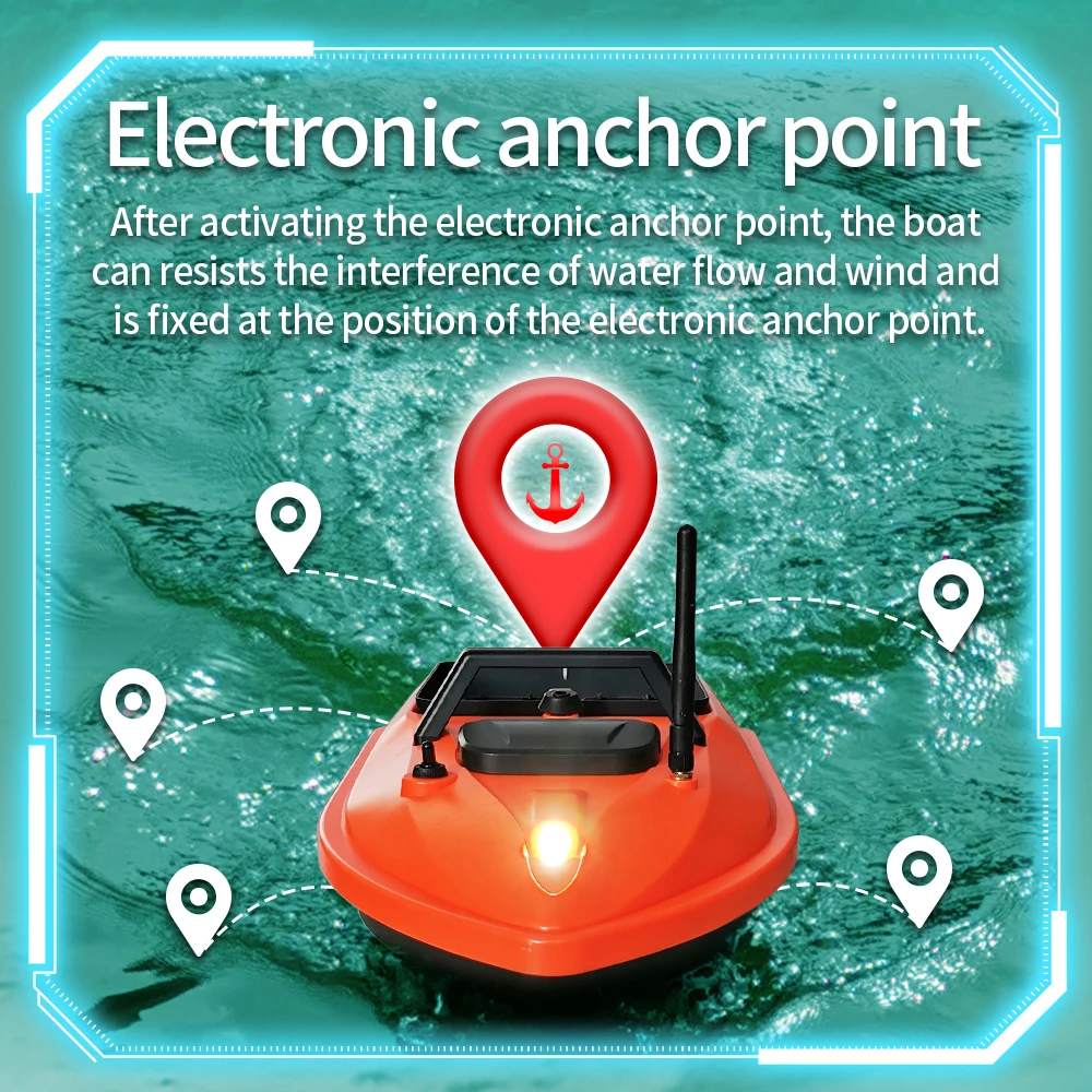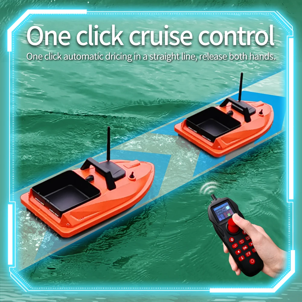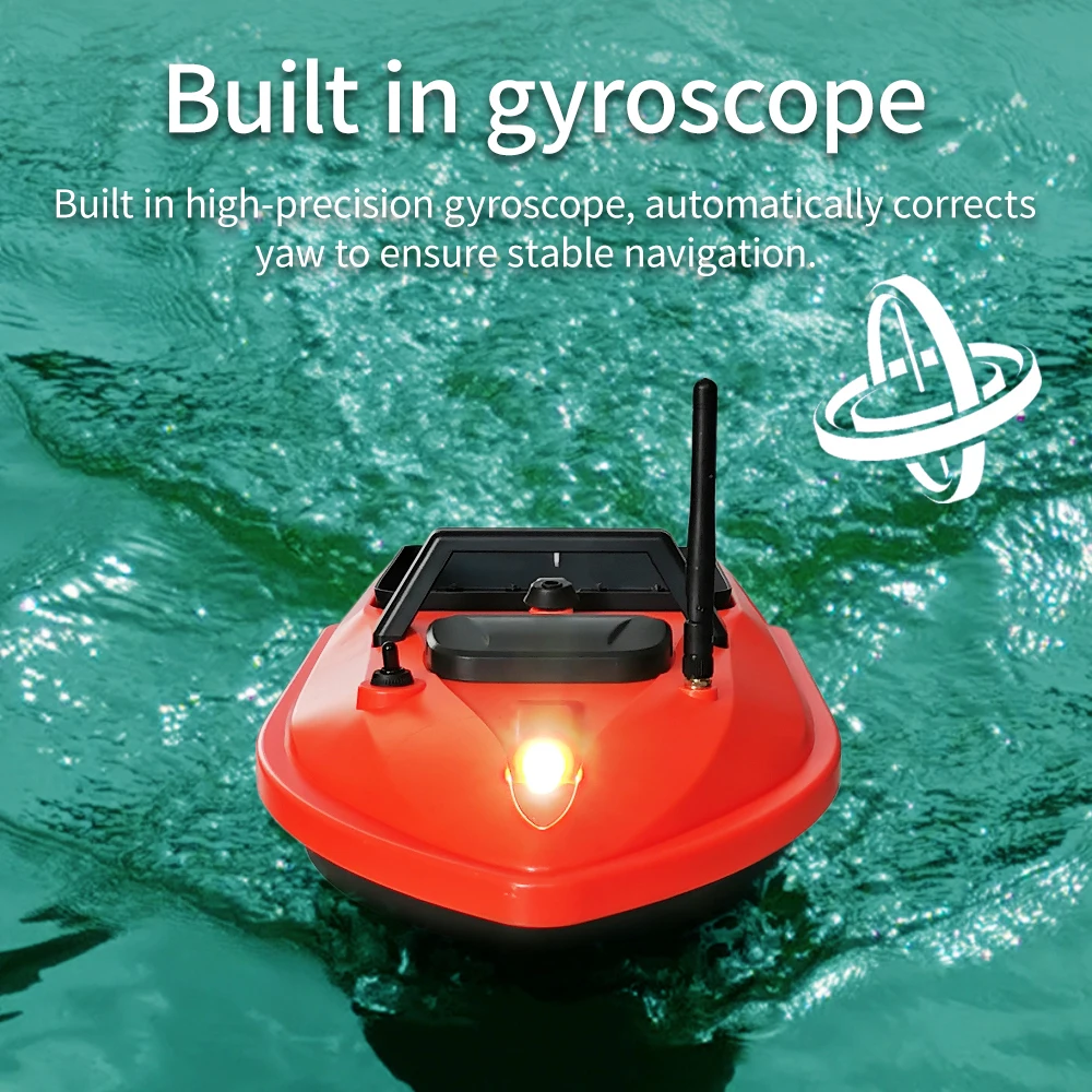 Este barco de cebo cuenta con control de navegación inteligente, que admite movimientos hacia adelante, atrás, izquierda y derecha con un manejo suave y receptivo.Un sistema giroscópico incorporado de alta precisión corrige automáticamente la desviación del curso, asegurando un viaje recto y estable incluso con viento o bajo cargas pesadas.El control de crucero con una sola tecla mantiene una velocidad constante, mientras que el crucero de waypoint a waypoint permite que el barco navegue automáticamente entre lugares de pesca preestablecidos para una máxima eficiencia.
