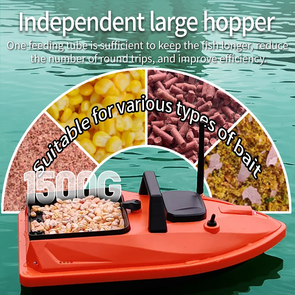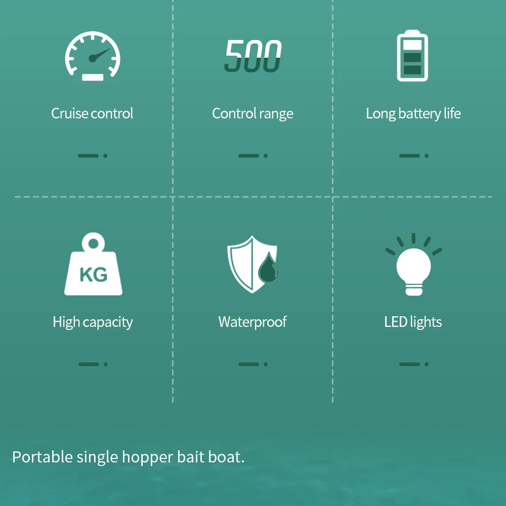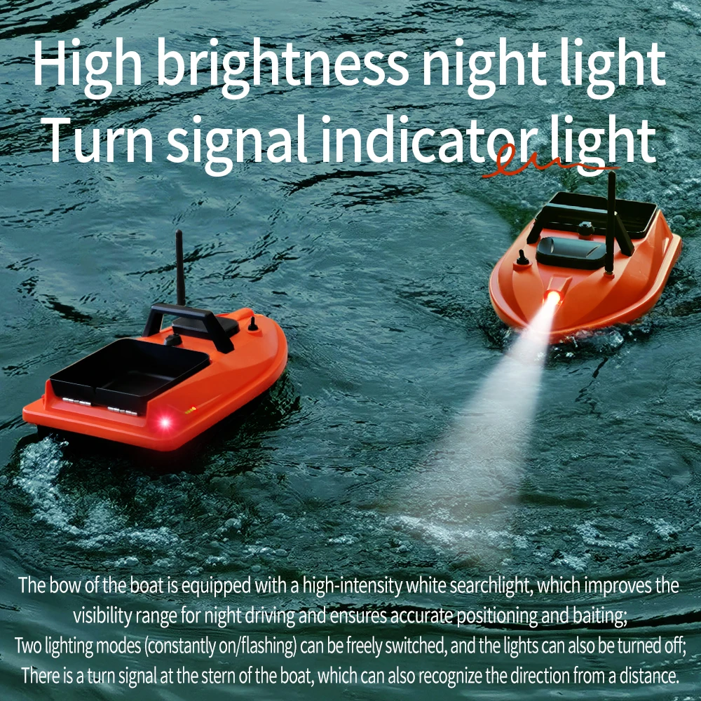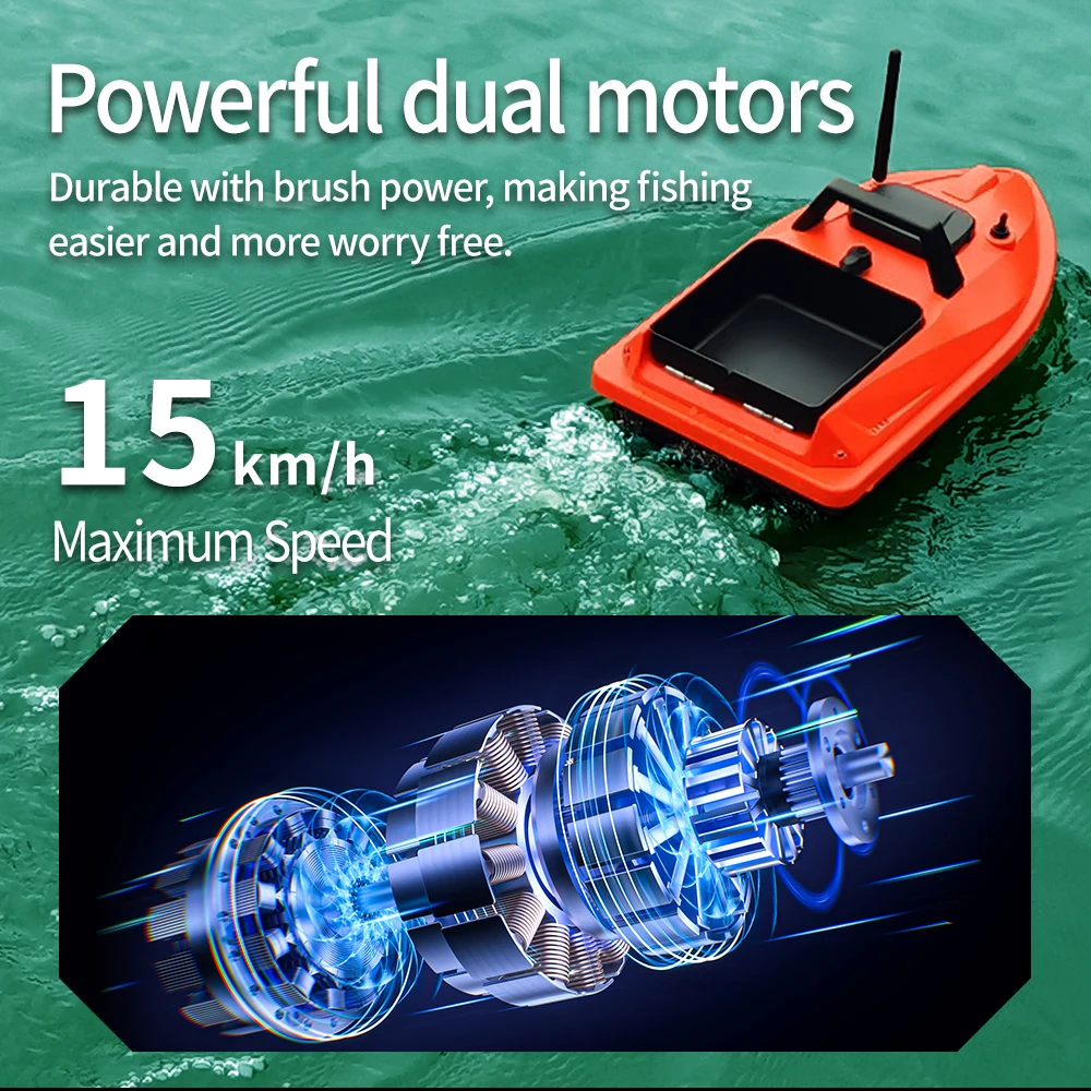 Este barco de cebo cuenta con control de navegación inteligente, que admite movimientos hacia adelante, atrás, izquierda y derecha con un manejo suave y receptivo.Un sistema giroscópico incorporado de alta precisión corrige automáticamente la desviación del curso, asegurando un viaje recto y estable incluso con viento o bajo cargas pesadas.El control de crucero con una sola tecla mantiene una velocidad constante, mientras que el crucero de waypoint a waypoint permite que el barco navegue automáticamente entre lugares de pesca preestablecidos para una máxima eficiencia.