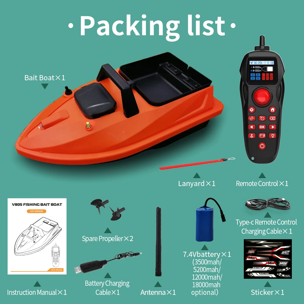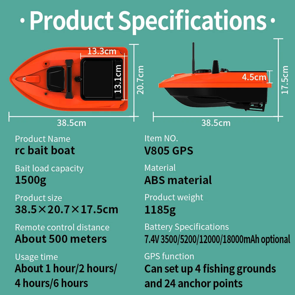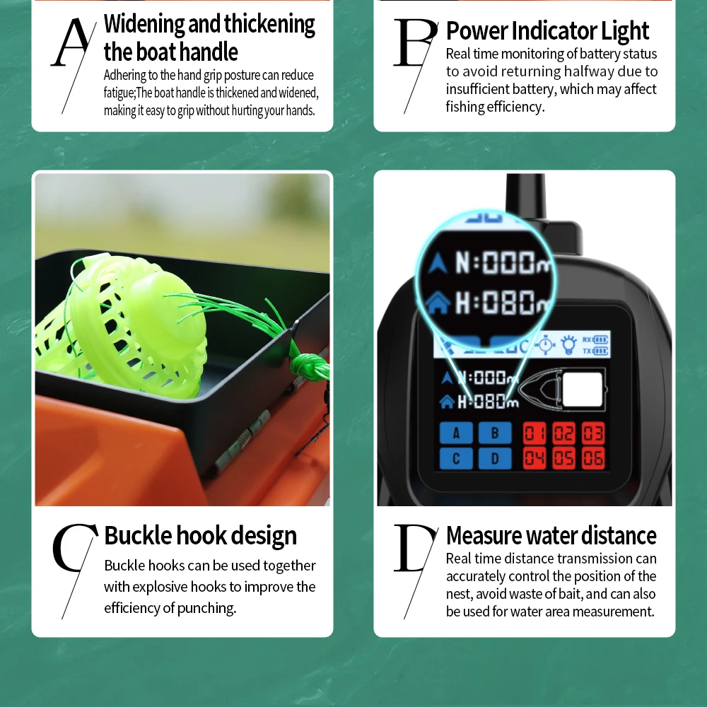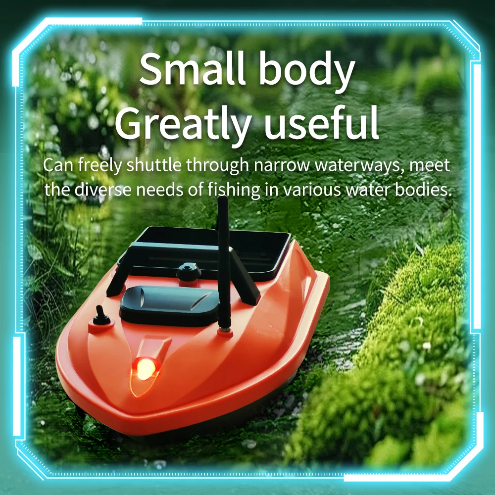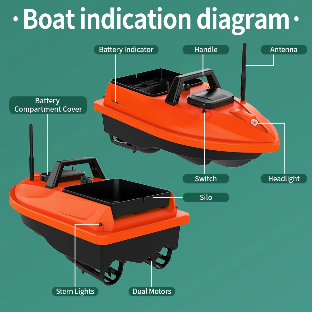 Este barco de cebo cuenta con control de navegación inteligente, que admite movimientos hacia adelante, atrás, izquierda y derecha con un manejo suave y receptivo.Un sistema giroscópico incorporado de alta precisión corrige automáticamente la desviación del curso, asegurando un viaje recto y estable incluso con viento o bajo cargas pesadas.El control de crucero con una sola tecla mantiene una velocidad constante, mientras que el crucero de waypoint a waypoint permite que el barco navegue automáticamente entre lugares de pesca preestablecidos para una máxima eficiencia.