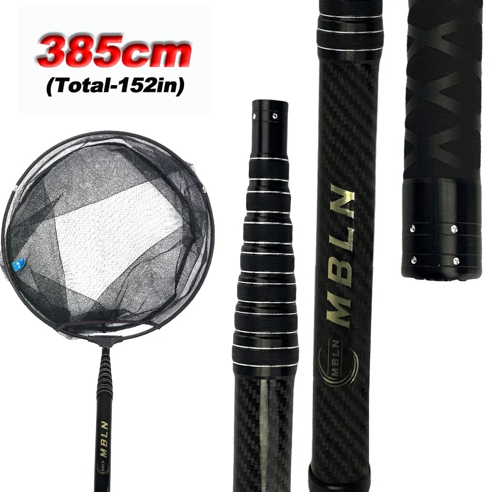 MBLN Red de aterrizaje de fibra de carbono, poste telescópico de 385 cm, doblado de 158 cm, aro de 45 cm, carbono de 2 capas + epoxi, con bloqueo de posicionamiento, red de mano