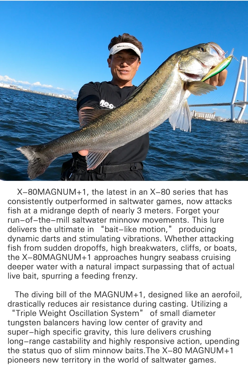 The X-80 MAGNUM+1 is based on the X-80 series X-80 MAGNUM, the unchanging "standard" that continues to dominate the world's salt scene, and was developed to capture the midrange of around 3m. It pursues "bait-like movement" to the limit, leaving behind the common sense action of salt minnow, and generates a new edgy "stimulation wave". Approach from steep surf, high-footed breakwaters, rocky shores, boats, etc., and approach sea bass and blue-runners cruising deep in search of bait with a natural impact that surpasses live bait, leading to an overwhelming feeding mode. and drive. The diving building, which was born from an aeroform in consideration of the frontal projection area, dramatically reduces air resistance during casting. In addition, the low center of gravity, ultra-high specific gravity, and small diameter tungsten balancer are "triple center of gravity movement" to achieve overwhelming long castability and high response action that overturn the common sense of slim minnows. The X-80 MAGNUM+1 will open up a new frontier for salt minnows.