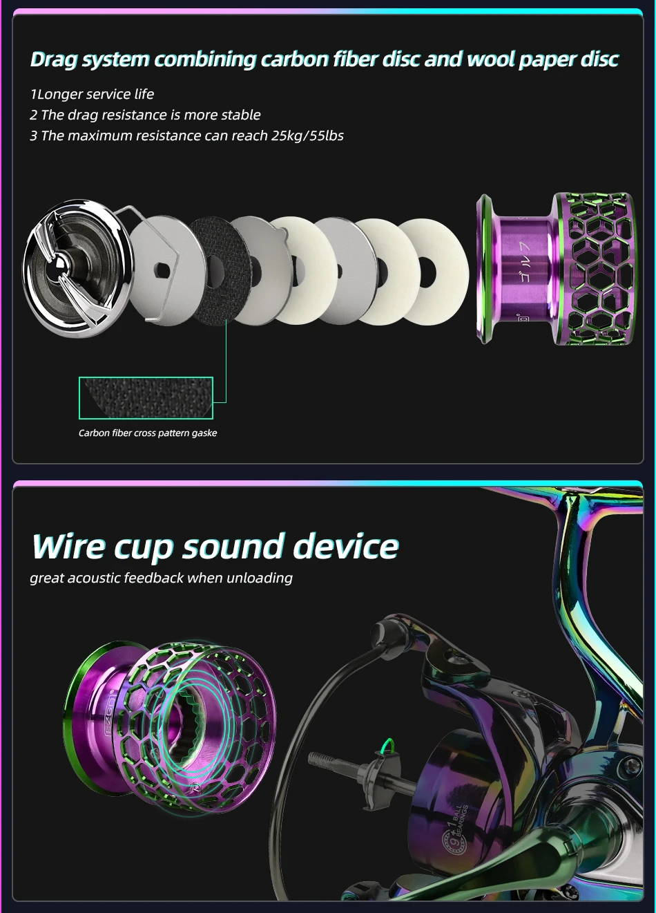 6. El diseño ultrafino del cuerpo y el carrete de aluminio mecanizado por CNC son ideales para pescar durante mucho tiempo.