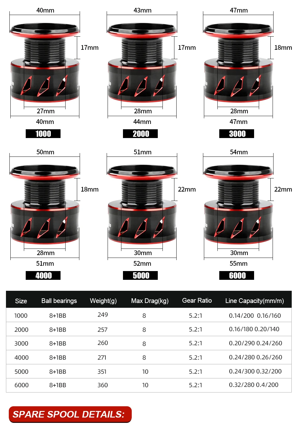 1000| Relación de engranajes: 5,2:1| Peso: 249 g| Rodamientos: 8+1BB| Arrastre máximo: 8KG| Capacidad de línea (mm/m): 0,14/200,0,16/160