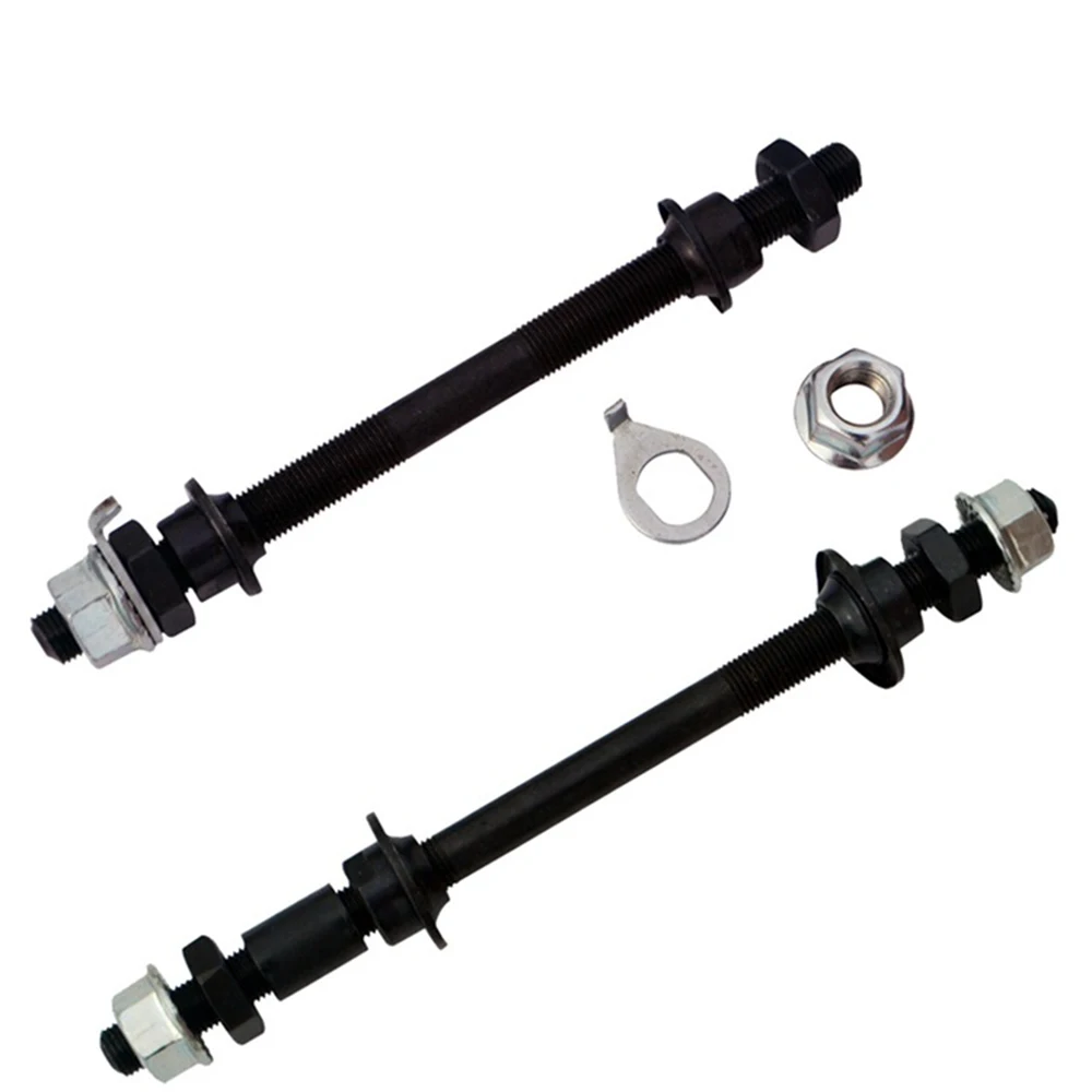 Type:Bike Solid Shaft Material: Iron Length: front 150mm rear 180mm Axle: 9mm Thread diameter: 9.5mm Weight:285g/pair Color: Random (Black/Silver) Package includes: 1pcs / 1 pair Bike Solid Shaft Note: The color sent by randomly.
