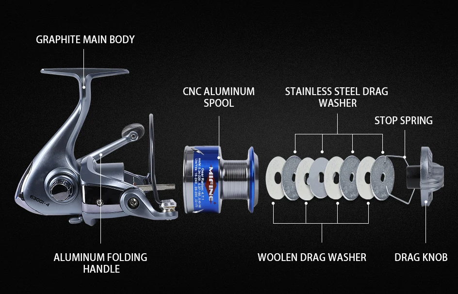 ● Alta resistencia-MIFINE no sacrificó durabilidad por peso ligero. El cuerpo principal de grafito de alta resistencia endurecido y el eje principal de acero inoxidable lo convierten en un carrete de pesca duradero.