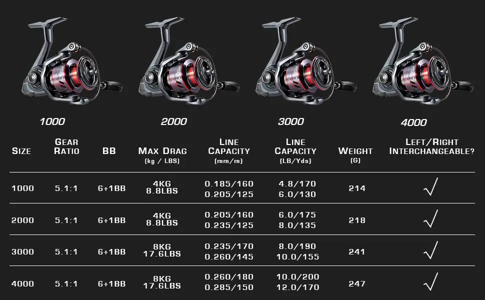 La diferencia de tamaño permite diferentes pruebas de libras y yardas para los carretes. Cuanto mayor sea el número, mayor será la prueba de libras que pueda poner en el carrete.