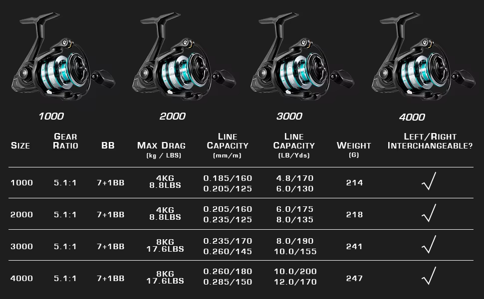 La diferencia de tamaño permite diferentes pruebas de libra y yardas para los carretes.Cuanto mayor sea el número, mayor será la prueba de libra que puedes poner en el carrete.