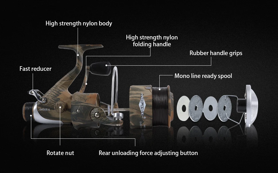 ● Marco de nailon de alta resistencia: el cuerpo de nailon antioxidante y resistente a la corrosión aumenta la longevidad del carrete giratorio.