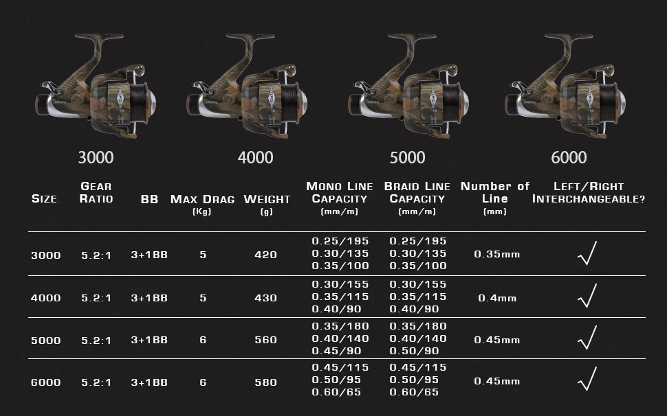 ● Carrete listo para línea Mono: El carrete de pesca de carpa Tele viene con carrete listo para línea mono, tamaño 3000-0,35mm 100m, tamaño 4000-0,4mm 90m, tamaño 5000-0,45mm 95m, tamaño 6000-0,45mm 95m.
