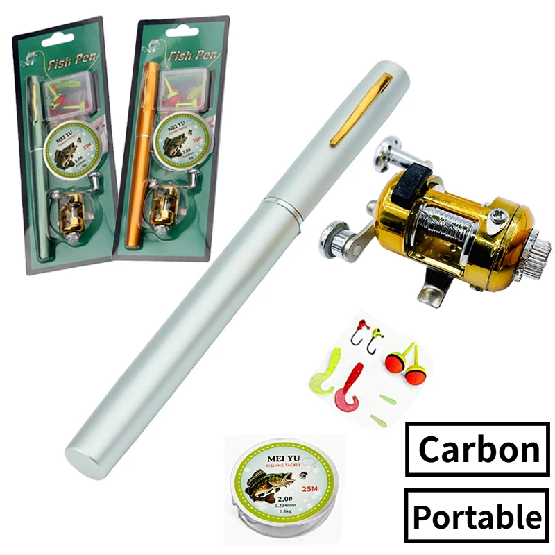 Mini caña de pescar con forma de bolígrafo de bolsillo y carrete de tambor giratorio, Combo de caña de Baitcasting portátil telescópica, 7 colores con Kits de regalo de línea