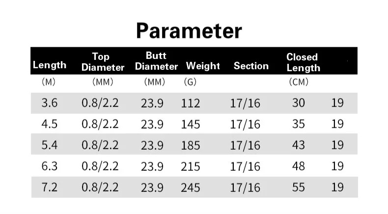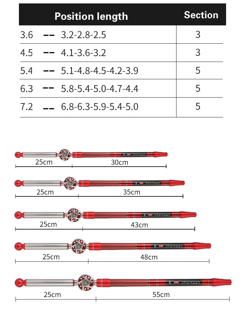 Longitud: 3,6-7,2 M Longitud cerrada: 30-55cm