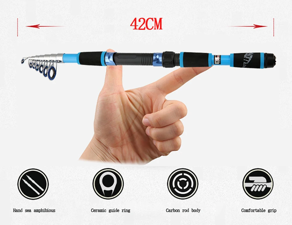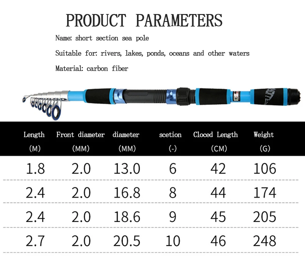 Varilla Flexible y sensible ligeramente, fuerte y duradera, la longitud de contracción de 1,8 m es de solo 42CM 1. Anfibio marino de mano 2. Anillo guía de cerámica 3. Cuerpo de la varilla de carbono 4. Agarre cómodo