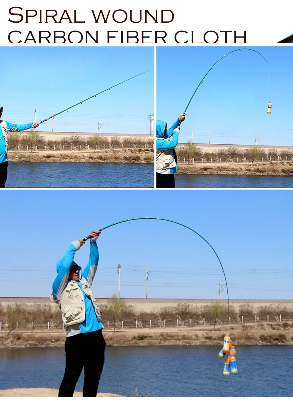 1. Esta caña de pescar está hecha de fibra de carbono, fuerte y duradera.