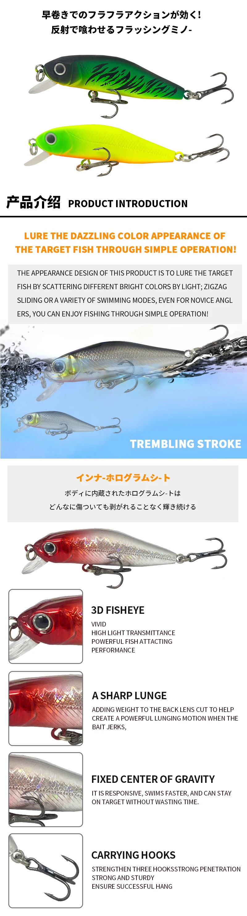 ** El diseño de apariencia de este producto es atraer al pez objetivo dispersando diferentes colores brillantes por la luz; deslizamiento en zigzag o una variedad de modos de natación. Incluso para los pescadores novatos, ¡puedes disfrutar de la pesca a través de una operación simple!
