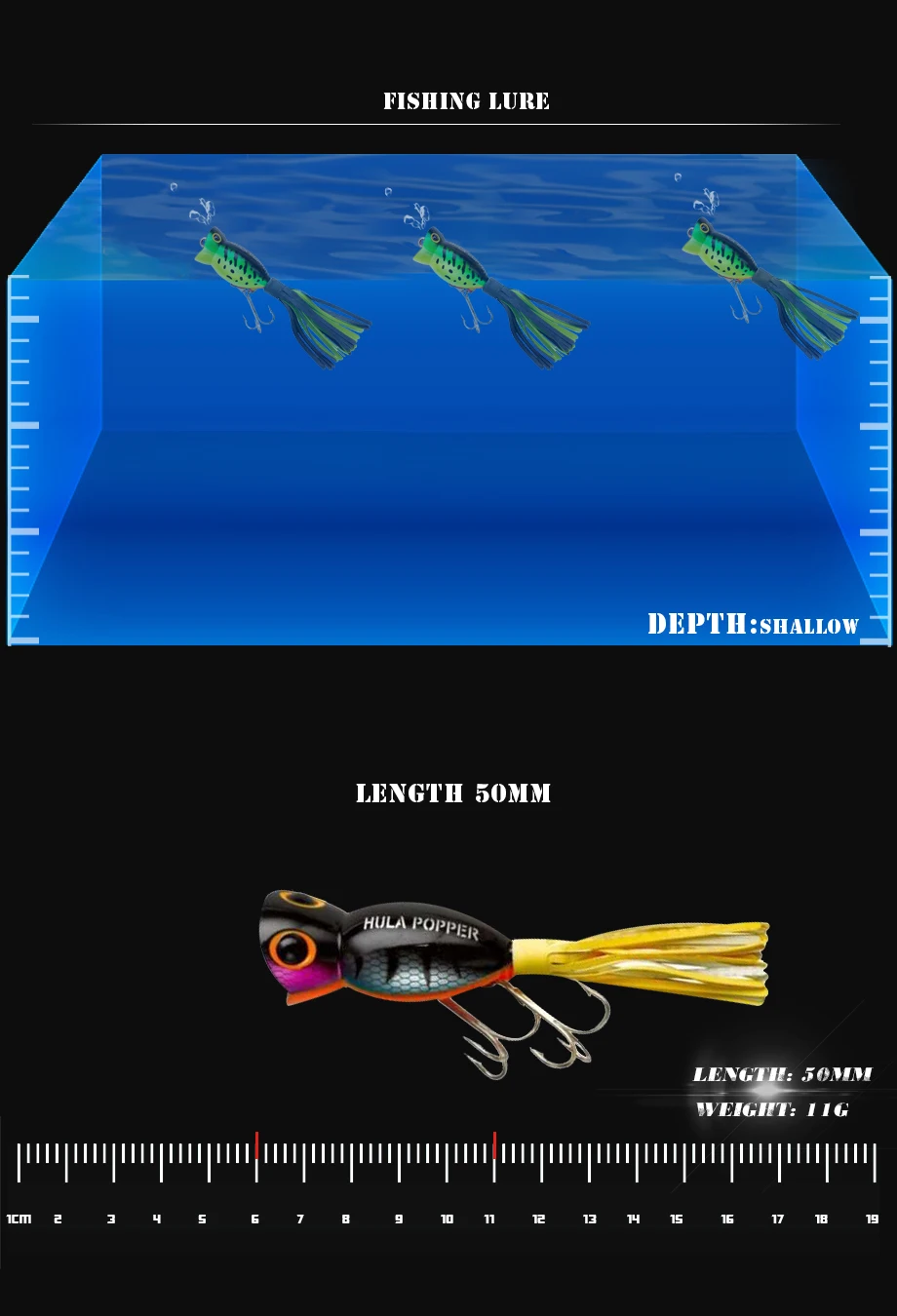 Señuelo de Pesca Popper Topwater, cebo de rana con colas de colores, 50mm, 11g, cebo Artificial flotante, Wobbler, Pesca