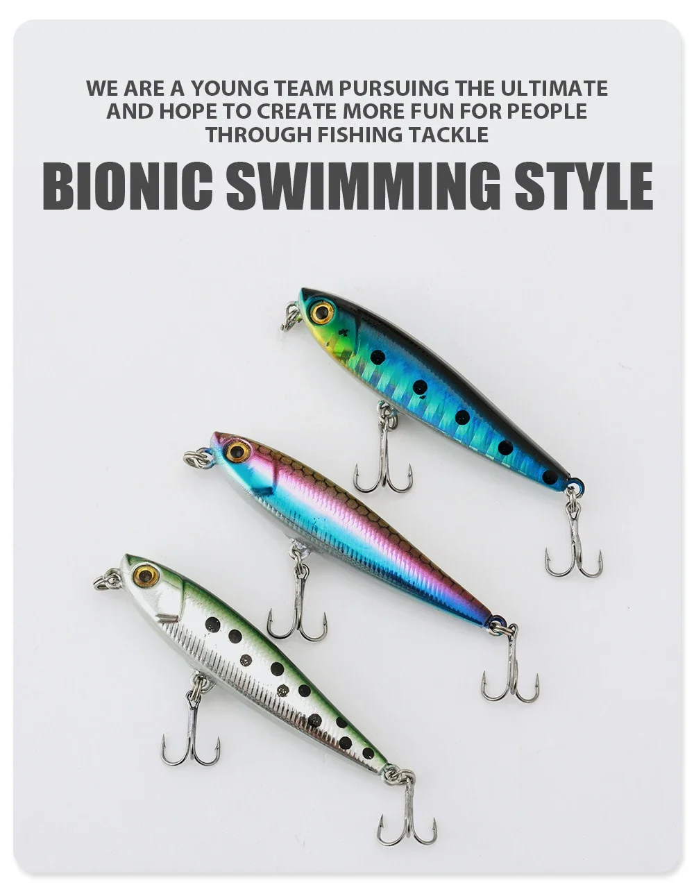60mm lápiz de hundimiento lento cebo duro 3,3G Stickbaits señuelo de pesca en forma de I perro caminando Swimbait cebo de pesca Biomimeticpencil cebo 1. COLORES BRILLANTES: increíble gama de colores y ojos 3D realistas, las formas realistas que nadan en el agua atraen más la atención de los peces. 2. BOLA DE METAL EN EL INTERIOR: con bola de acero en el interior, controla el baricentro fácilmente, lanza lejos, diseño de modelo de ruido, hace que los Señuelos de Pesca sean más fáciles de detectar. 3. Ganchos duraderos: excelente capacidad de perforación, fuerte resistencia a la abrasión, para garantizar el éxito de los bajos 4. Las mordeduras de peces inteligentes ocurren con frecuencia debido a las microondas extremadamente naturales. 5. El juego combinado de "suciedad de contracción" y "acción lenta en forma de I" produce resultados de pesca abrumadores.