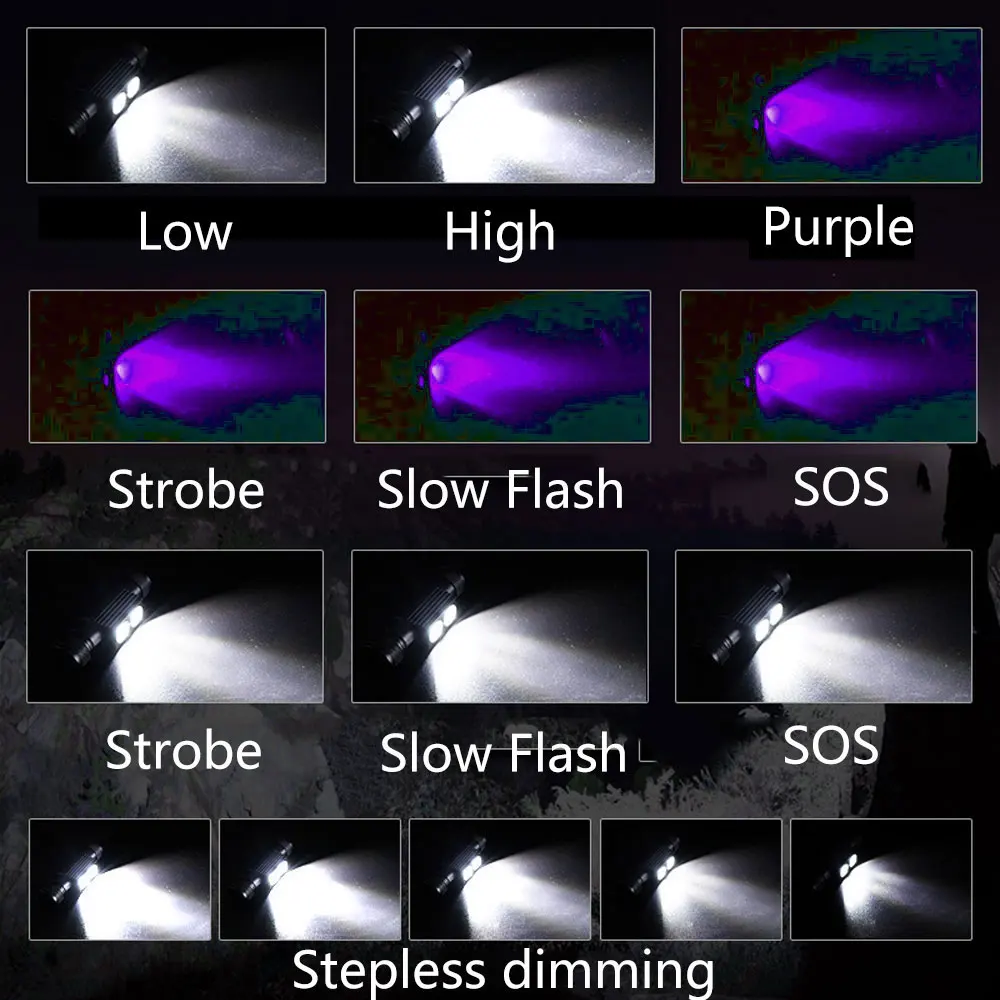 ●● MODOS DE ILUMINACIÓN.Blanco bajo/blanco alto/púrpura/flash morado/estroboscópico lento púrpura/SOS púrpura/estroboscópico blanco/flash lento blanco/SOS blanco/atenuación continua.Hay más modos disponibles.