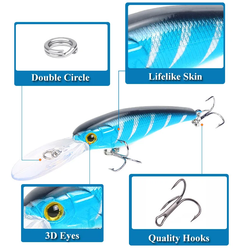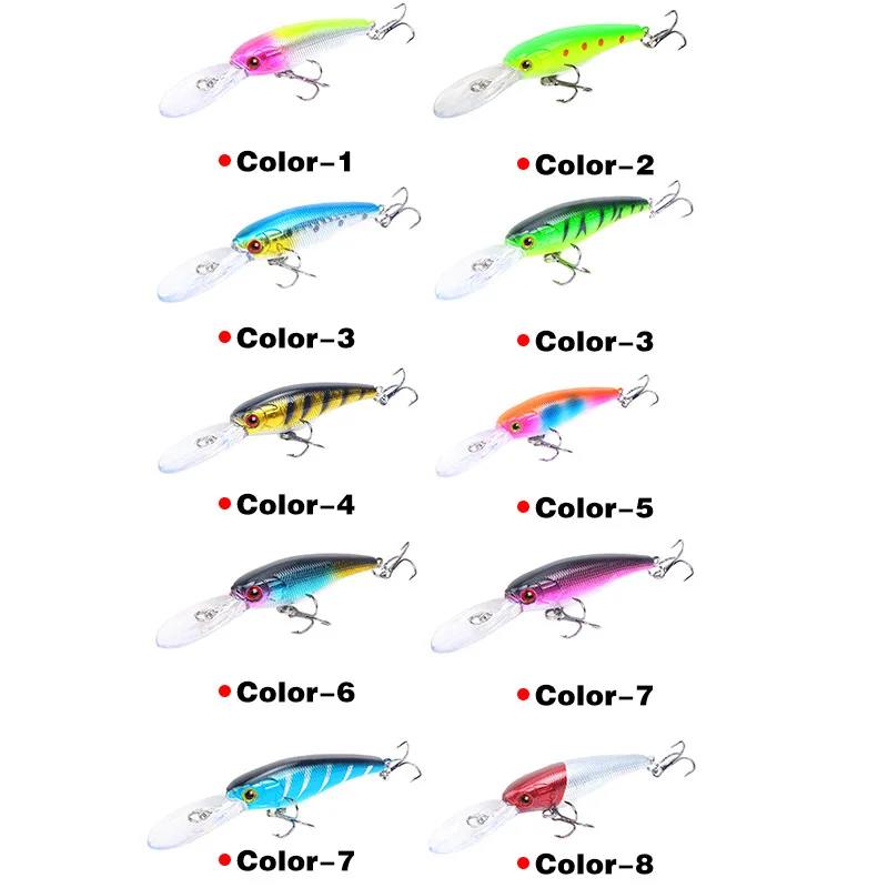Características del producto: 1. El cuerpo del cebo adopta materiales avanzados de protección ambiental, no solo tiene una alta resistencia al impacto, sino que tampoco produce sustancias nocivas para el medio ambiente. 2. El cebo está diseñado para tener el mejor equilibrio para que el cebo pueda nadar a la velocidad de recuperación más lenta posible. 3. Los cebos tienen pintura realista y ojos 3D vívidos, hacen que el cebo parezca un pez real nadando en el agua durante la pesca. 4. Cuerpo colorido: Diseño de simulación, más atractivo para los peces. 5. Ganchos: anticorrosión, potencia más fuerte, duradero, agua de mar dulce universal. 6. Bolas de metal: Bolas de acero inoxidable en el interior, para mantener el equilibrio del señuelo de pesca, para la mayor distancia de lanzamiento. 7. Anillos bicíclicos más fuertes: fortalece el círculo doble y aumenta la resistencia a la tracción. 8. Simulación de piel de pez (láser): el diseño de simulación de piel de pez la hace más atractiva para los peces grandes. 9. A diferencia de las populares uniones de ahorro realizadas por empresas populares. Bearking utiliza un proceso detallado que requiere mucho tiempo. 10. El acabado del borde y el proceso de desbarbado de precisión reducen el área apareada áspera de los señuelos a una superficie lisa. 11. Para probar la integridad de la adhesión, los señuelos se prueban con agua, sumergidos en agua caliente que excede los 70 grados durante unos 20 segundos.
