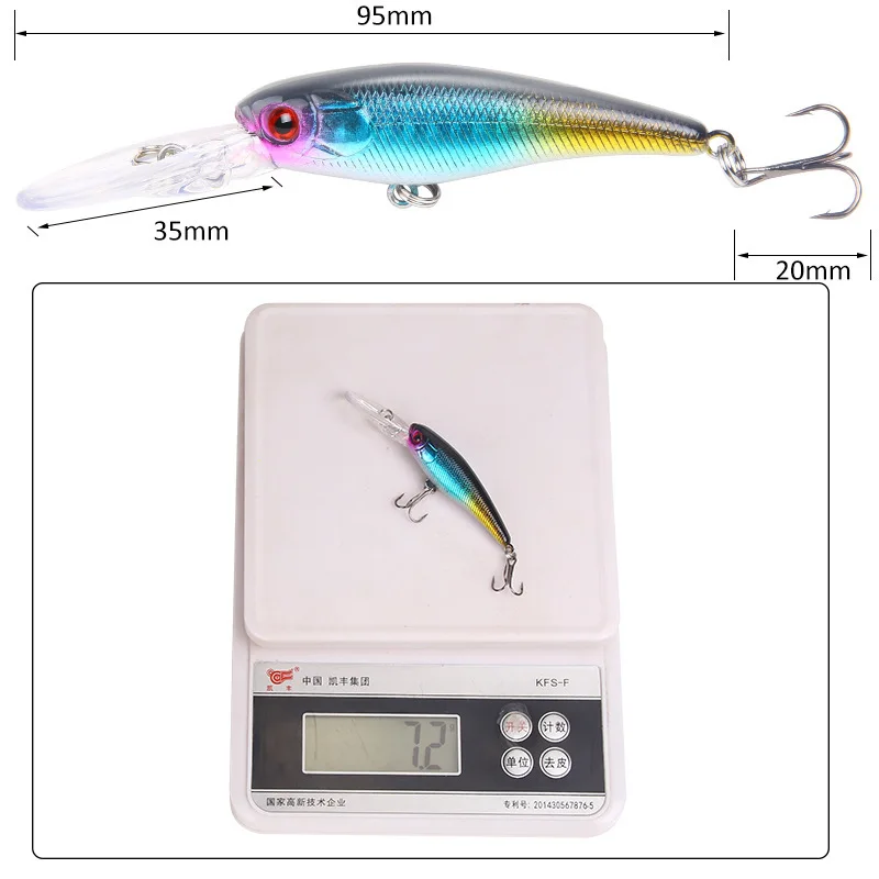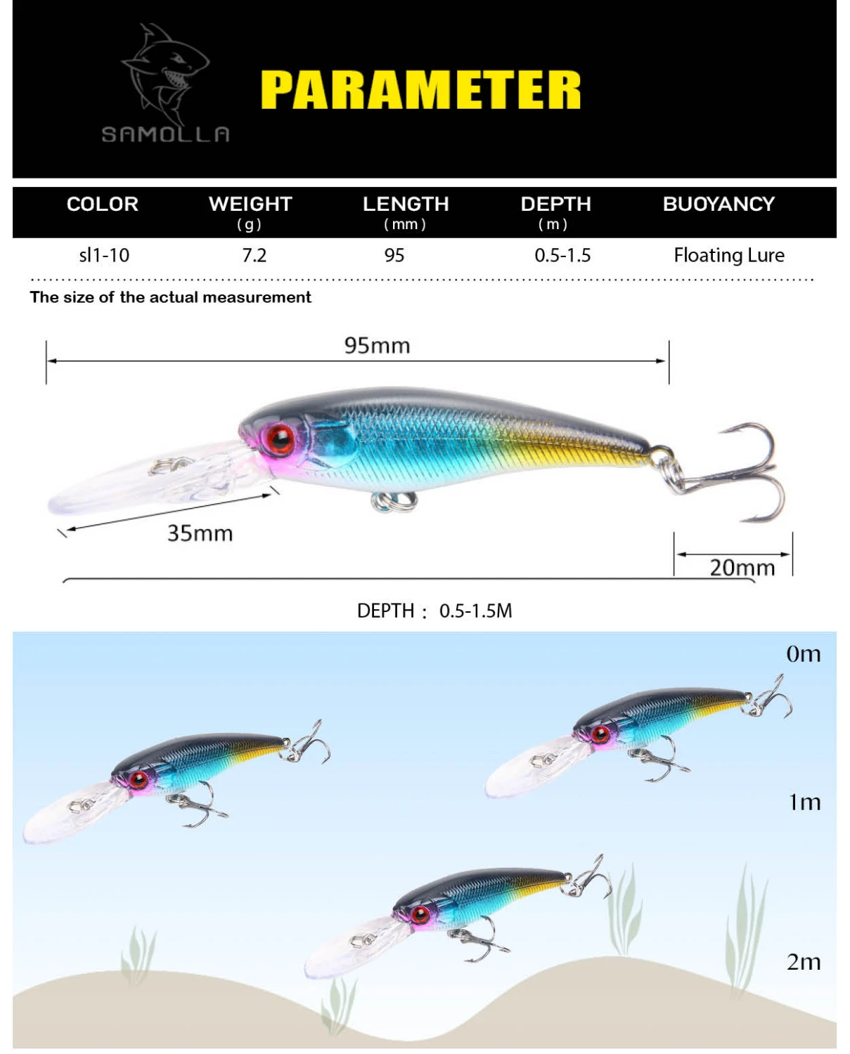Detalles del producto: Marca: SAMOLLA Modelo de señuelo: Minnow Tipo de señuelo: señuelo de pesca duro Peso del señuelo: 7,2G Longitud del señuelo: 95mm Profundidad de buceo: 0,5-1,5 M Flotabilidad: señuelo flotante Ganchos: equipados con ganchos anticorrosión de la marca: Ojos: ojos de pez 3D Anillos: bicíclicos Colores: 10 colores